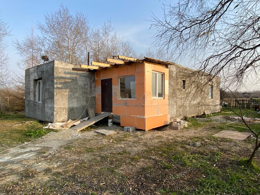 Второй -одноэтажный дом с плоской крышей 100 кв.м., новой постройки, ещё не оформлен. Свайно-ростверковый фундамент Стены залиты из полистиролбетона, толщина стен 50 см.  Перекрытия железобетон, утеплены пенополистиролом. Входная группа собрана из газобетонных блоков. Установлены окна с энергосберегающим покрытием. В дом заведена вода (центральное водоснабжение). Для отопления приобретен твердотопливный котел и все необходимое для подключения теплого пола, но сам пол ещё не смонтирован.