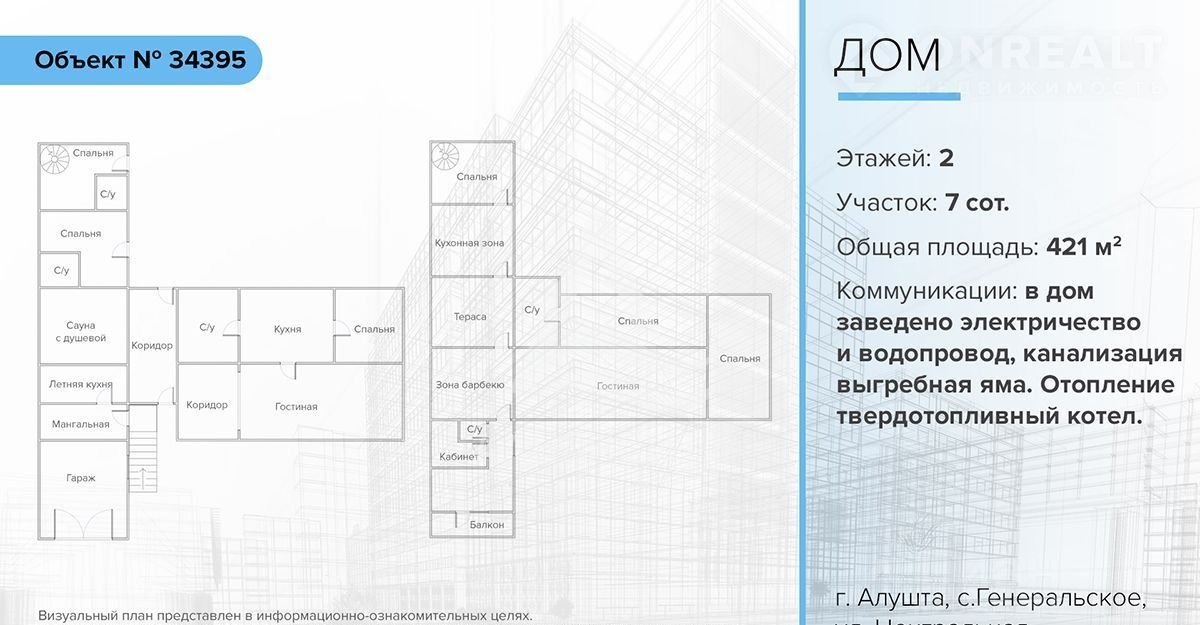 Продается жилой дом с земельным участком в городе Алушта, село Генеральское, улица Центральная. Общая площадь дома 421 кв. м. Общая площадь участка: 700 кв.м. Назначение земли: индивидуальное жилищное строительство. Отличное решение для постоянного проживания или отдыха для тех, кто всегда хотел проживать вдали от городской суеты. Количество этажей: 2 1 этаж: гараж, мангальная зона крытая, летняя кухня, сауна с душевой, две спальных комнат со своими санузлами; крытый коридор во второе крыло, где расположено: гостиная, кухня, спальная комната и санузел. 2 этаж: бильярдный зал, спальная комната, кухонная зона, зона барбекю с летней кухней, кабинет с личным санузлом, столярная мастерская с выходом на открытый балкон, терраса; второе крыло: кухня-гостиная с выходом на балкон, две спальных комнаты, санузел. Дом устроен так, что параллельно с отдыхом или проживанием в главной части здания две части дома можно обустроить совершенно автономно, со своими спальными комнатами и удобствами, с отдельными входами. Это может быть для бизнеса или ваших гостей. В доме выполнен ремонт. Земельный участок имеет огороженную придомовую территорию с электрическими воротами, мощеный двор камнем, беседка во дворе и красивый сад с плодоносящими садовыми деревьями. Имеется крытый гараж на два автомобиля с электро-ролетом. Отличная локация: в 15 минутах езды от участка Вы сможете наслаждаться морем на просторных галечных пляжах села Солнечногорское. В 2-х км от села Генеральское находится один из самых древних и полноводных водопадов Крыма, водопад Джур-Джур, любоваться которым можно в любое время года. Ближайший населённый пункт Солнечногорское в 7 км, там же берег Чёрного моря (8 км). Расстояние до Алушты около 32 километров (по шоссе). Расположение данного земельного участка позволит Вам насладится чистым горным воздухом и живописным пейзажем, так как земельный участок расположен в окружении горного массива Караби-яйла и Демерджи-яйла. Посередине возвышается гребень горы Тырке. Фундамент - бутобетон, стены - ракушка. Имеются следующие коммуникации: отопление в главной части дома с помощью твердотопливного котла, в главной гостиной расположен рабочий камин, в дом заведено электричество и водопровод, канализация выгребная яма. Год постройки дома: 2007 Количество собственников: один Прописанных: один человек. Документы РФ готовы к сделке. Есть возможность оформить ипотечное кредитование. Дом продается исходя курса валют ( если падает дешевле ) Теплота и уют гарантированы - Агентствам просьба не беспокоить!