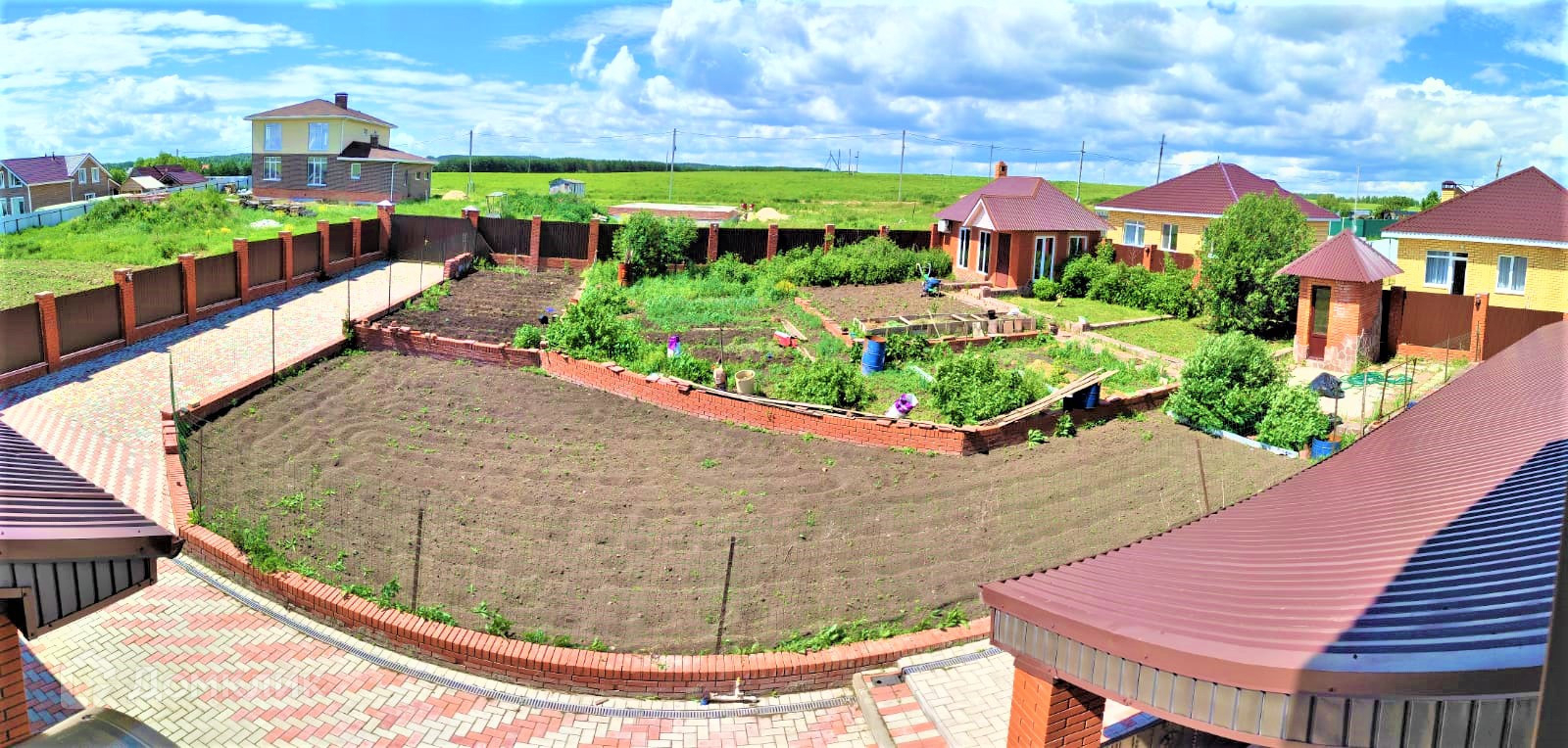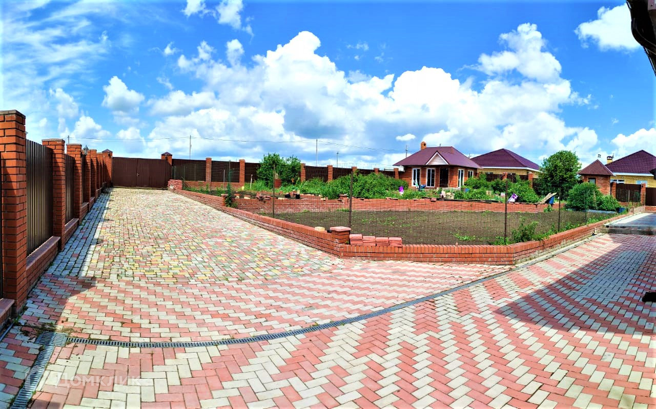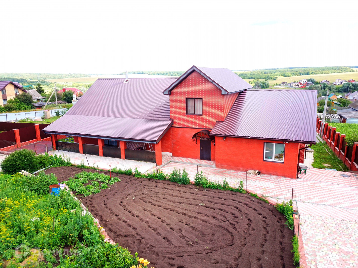 Вокруг дома двор в брусчатке, на отдельных участках высажен газон.