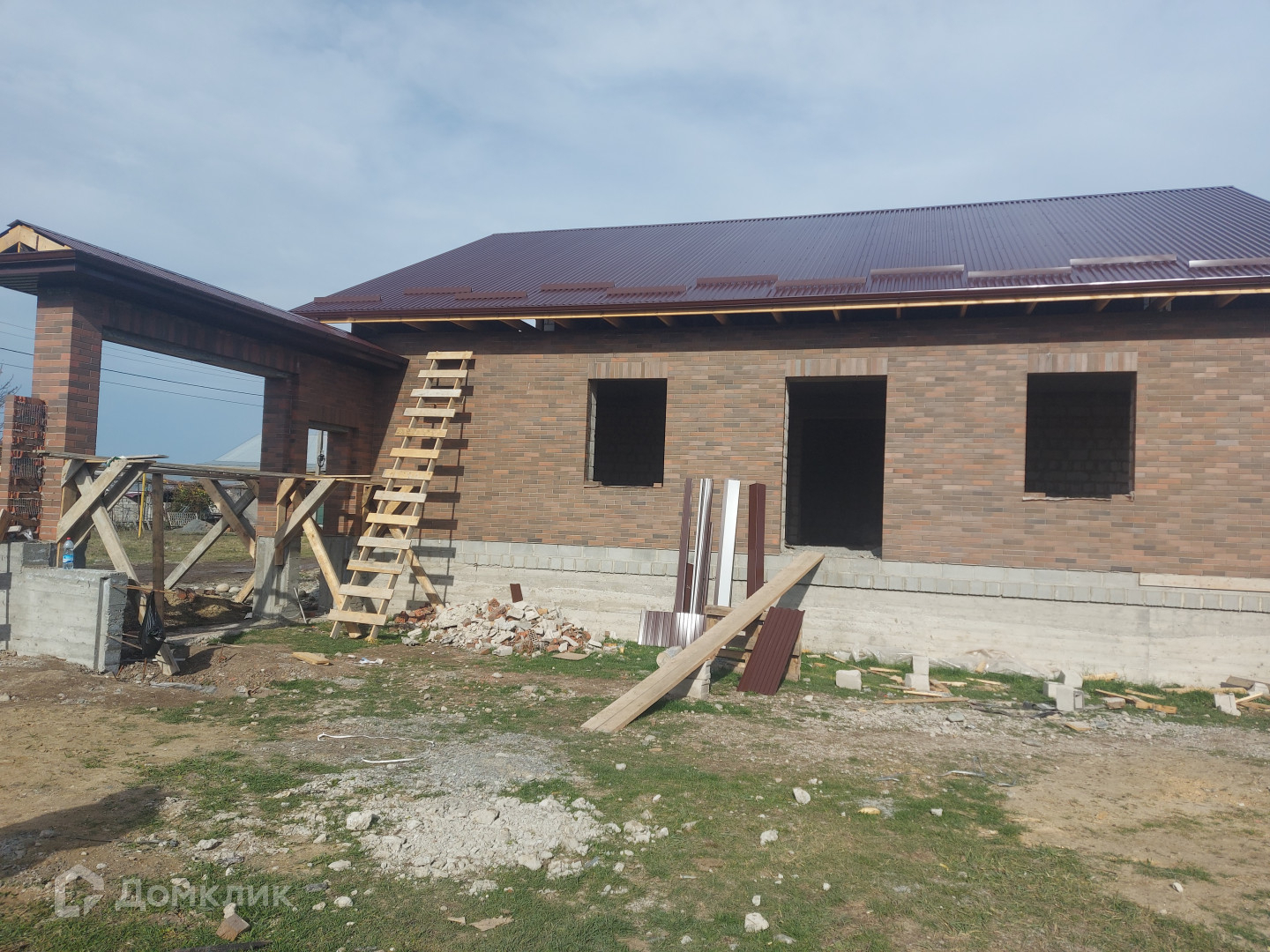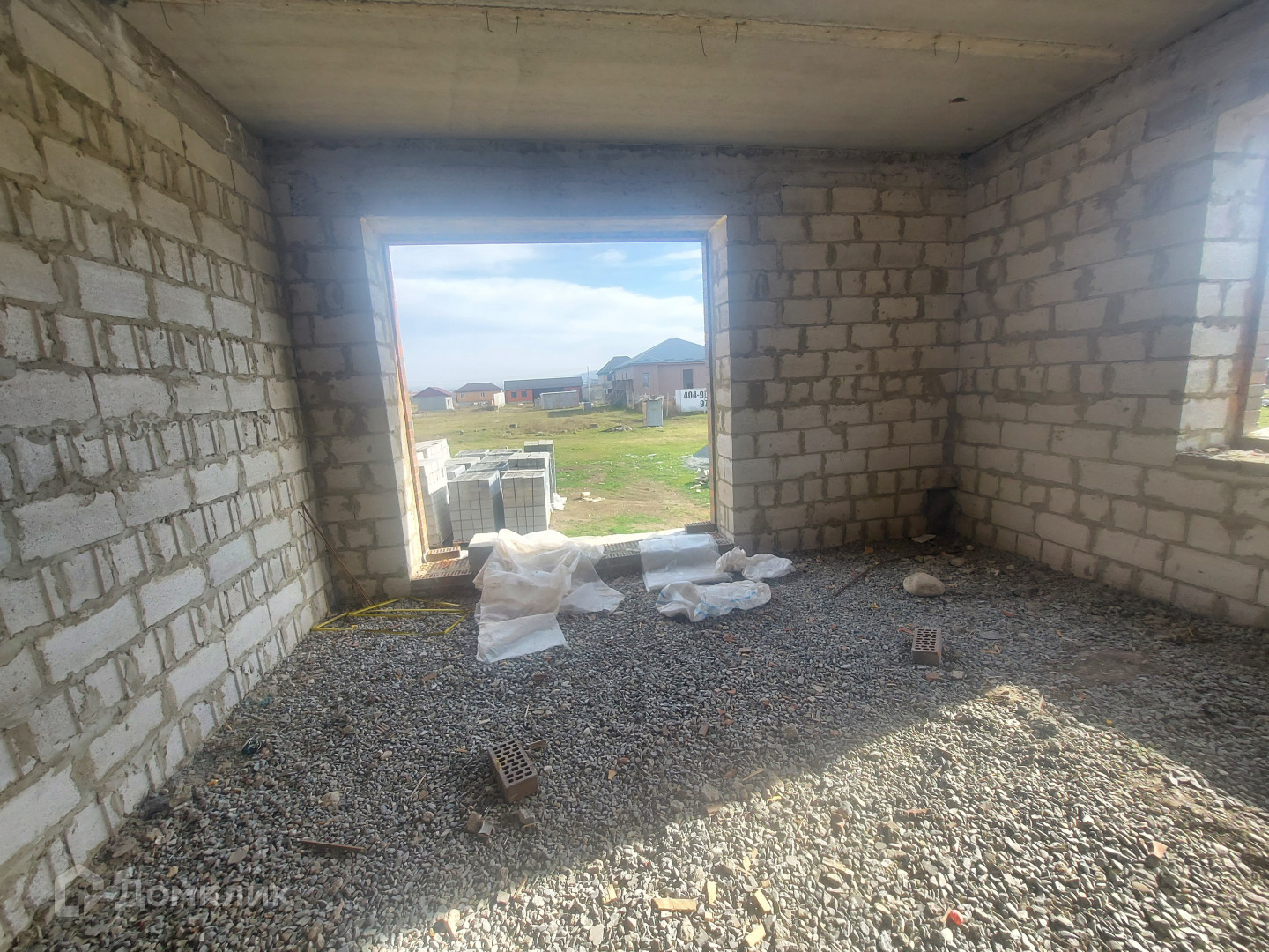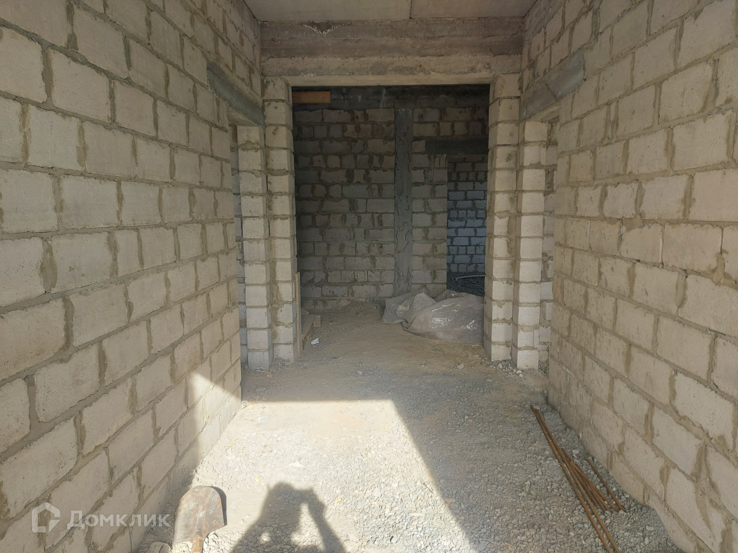 Под каждой стеной армированный ленточный фундамент, глубиной 1 м, шириной 0.60 м, цоколь высотой 1 м, шириной 0.50 м. Стены дома высотой 3.15 м из целого пеплоблока, облицованные кирпичом. Все стены связаны армированным поясом и установлены бетонные плиты перекрытия.