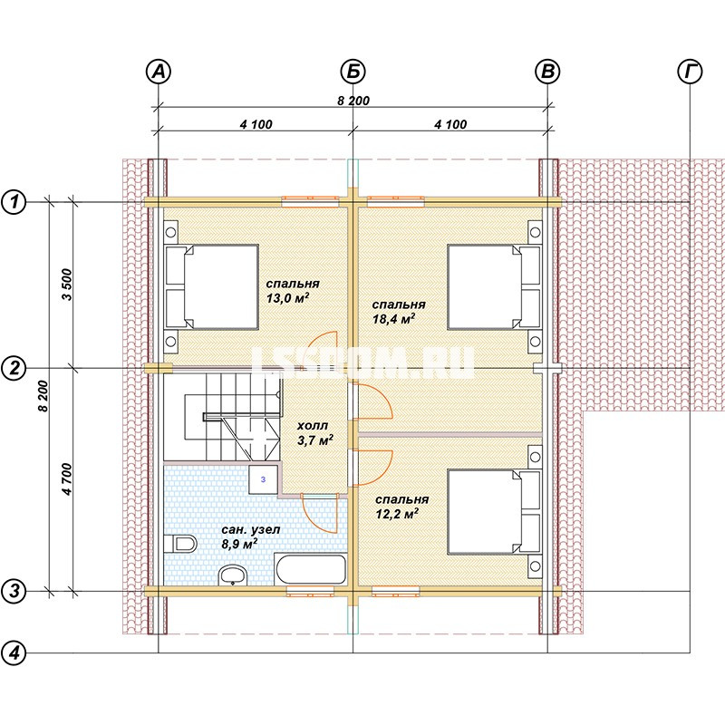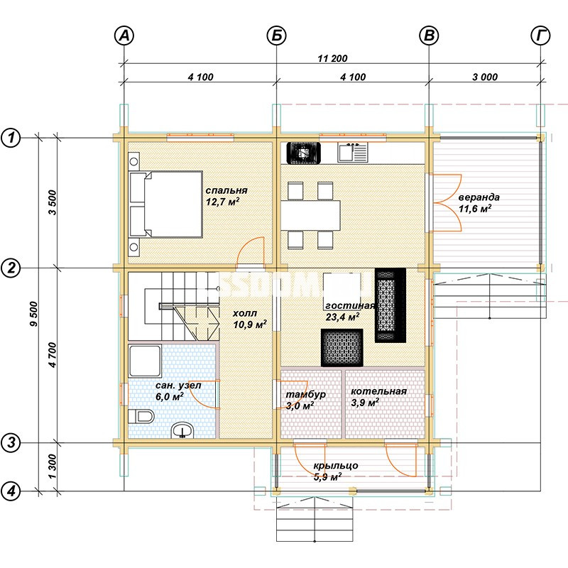 Двухэтажный дом из профилированного бруса с кровлей из металлочерепицы, общей площадью 133 м2 (площадь 1-го этажа 77,4 м2, площадь 2-го этажа 56,2м2).  Габариты дома –11,2 х 9,5 м.