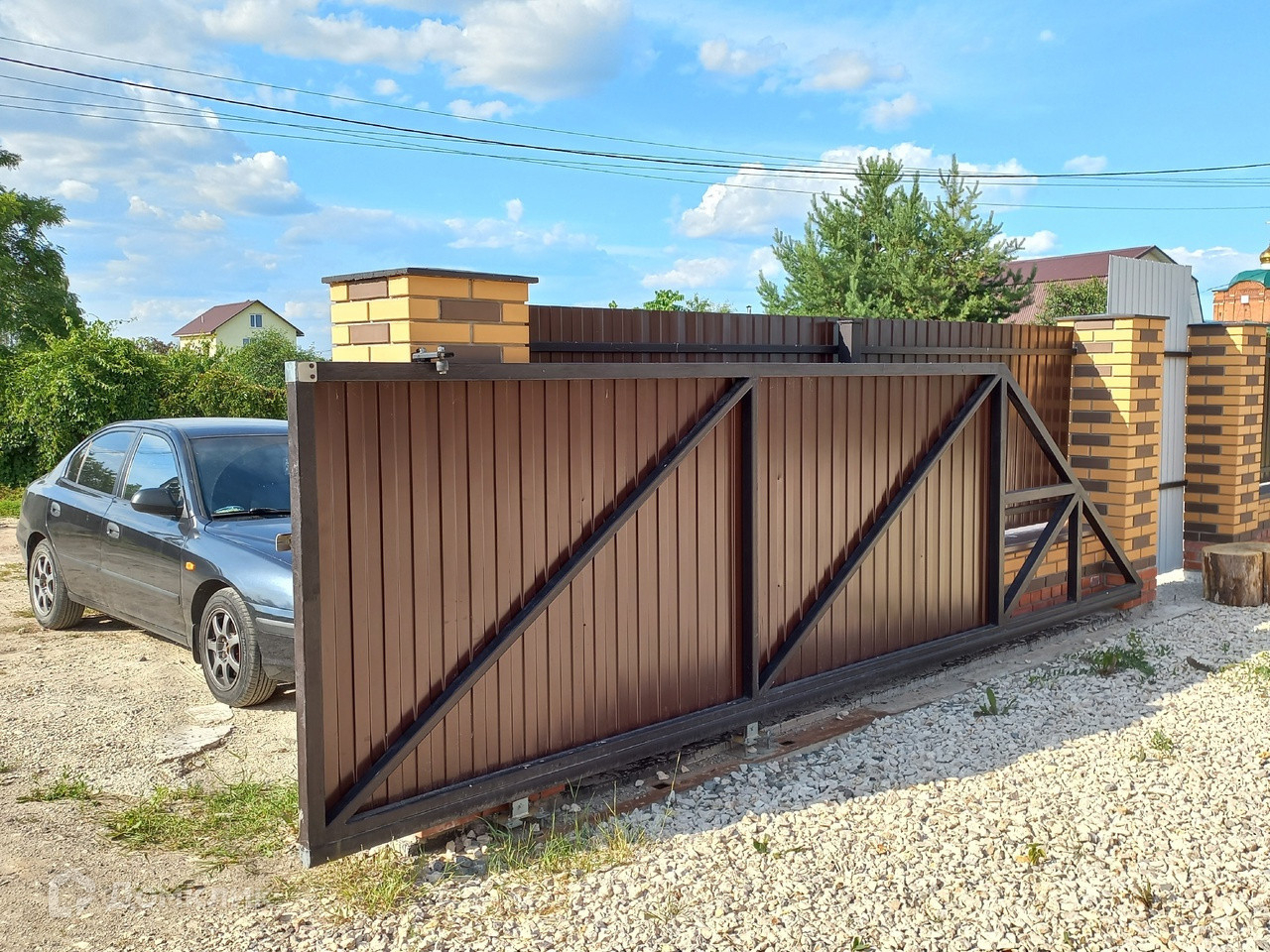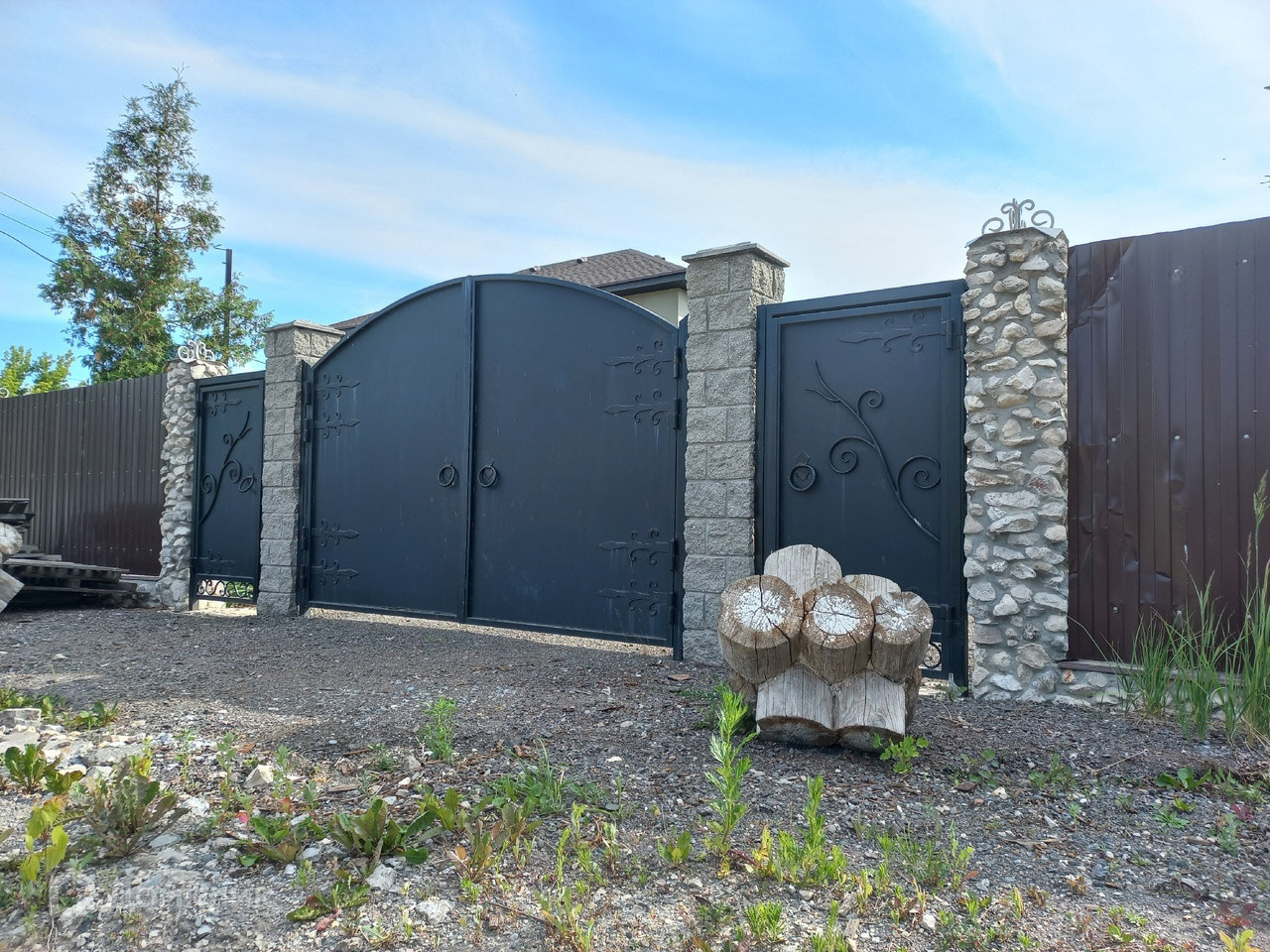 Перед домом на территории участка и вдоль забора за территорией есть место для парковки. Установлены двое ворот и калитка со стороны входной группы в дом и еще одни ворота с калиткой в задней части участка.