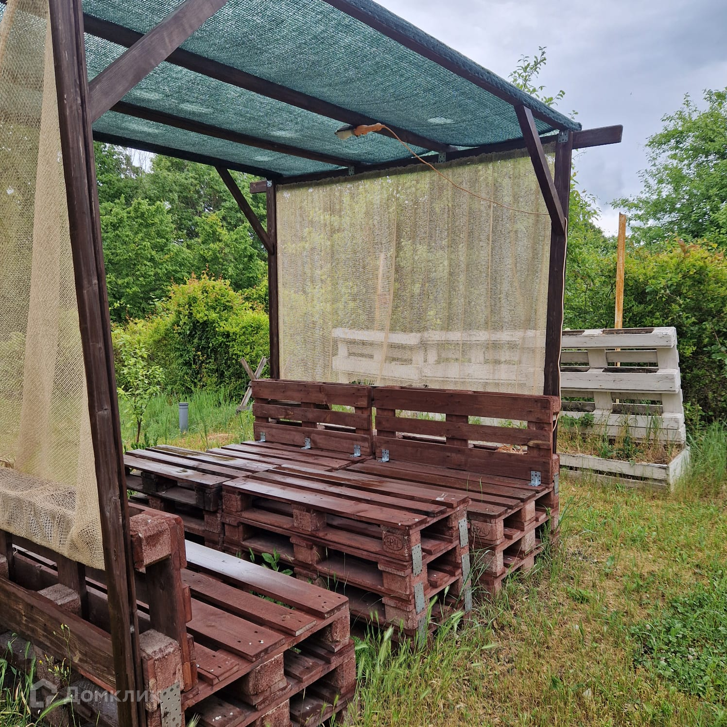 Для отдыха на свежем воздухе на участке есть деревянная беседка с лавочками и столиком, расположенная в тени деревьев.
