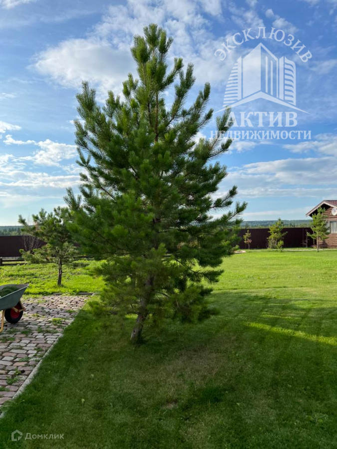 Ухоженный газон и мощение на участке, территориальное зонирование, высажены взрослые деревья - сосны, берёзы.