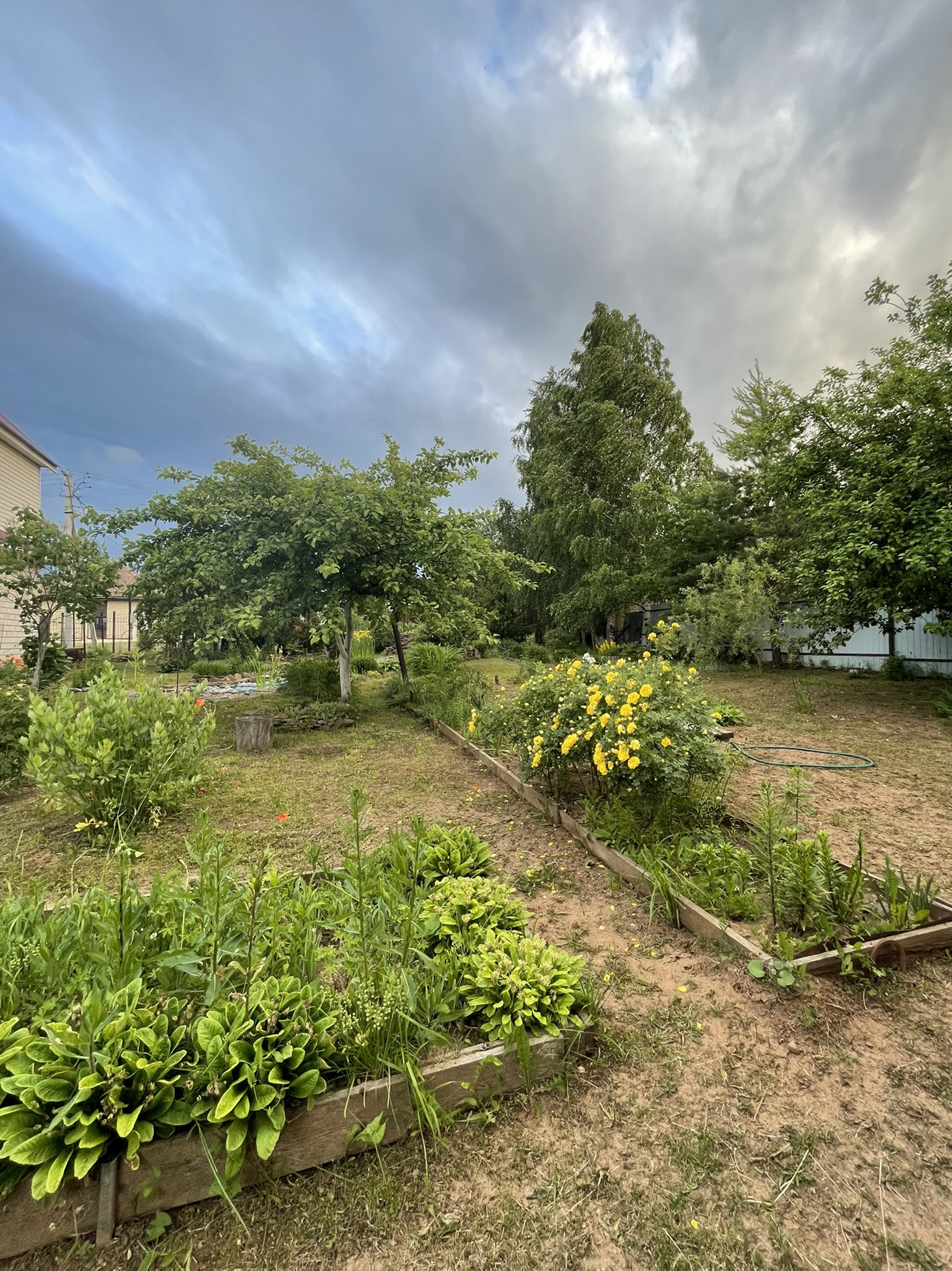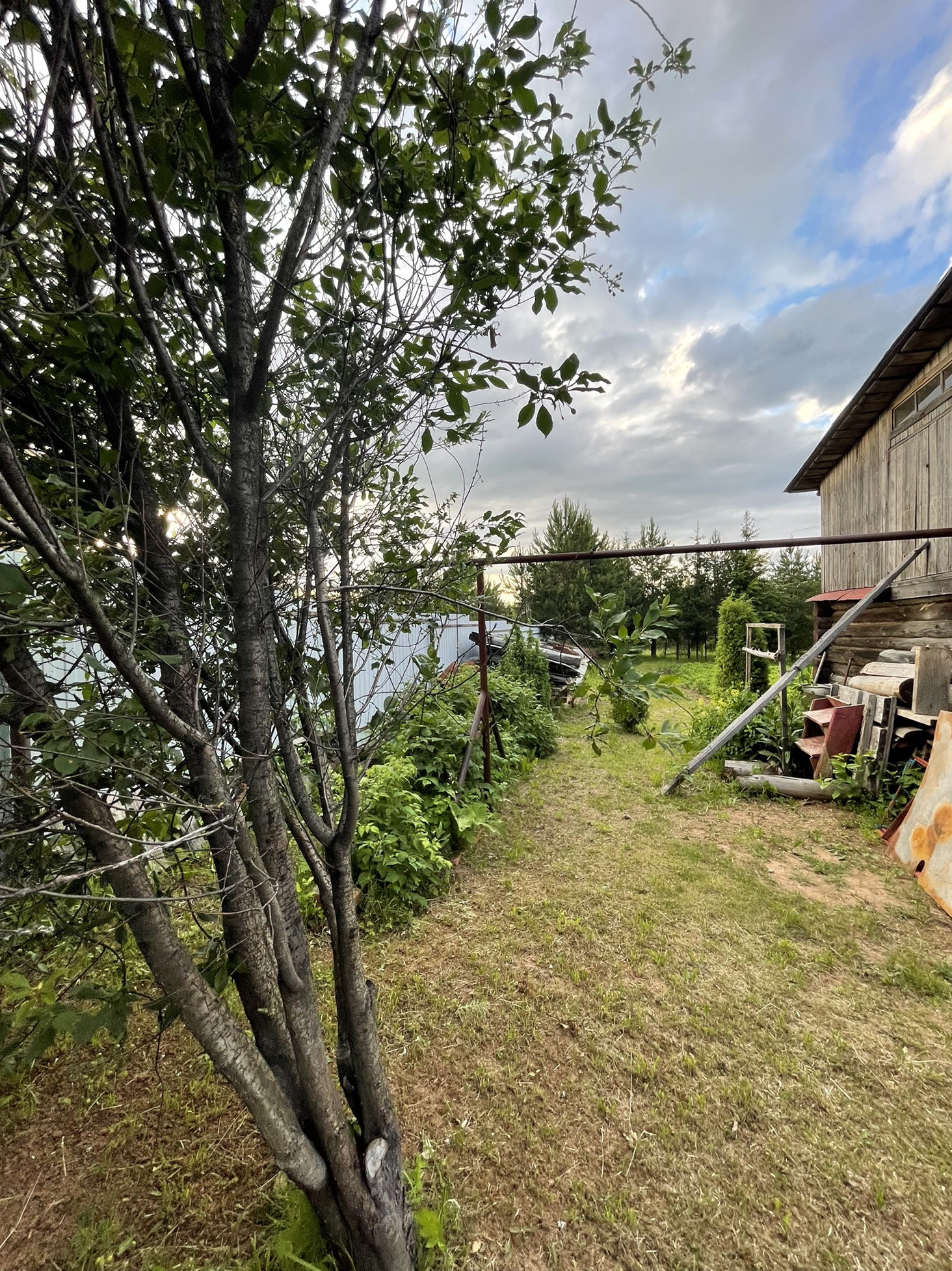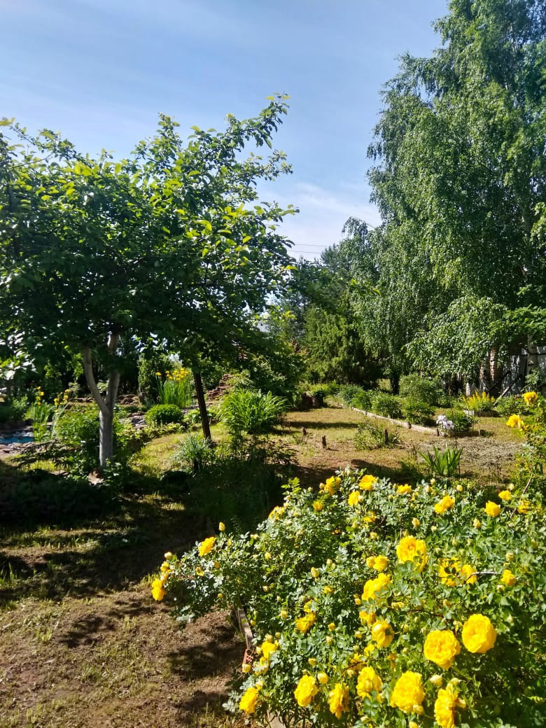 8 яблонь, 5 вишен, 3 куста сортовой смородины, Слива желтая, 3 темных очень вкусных крупных сливы, 3 грецких ореха.