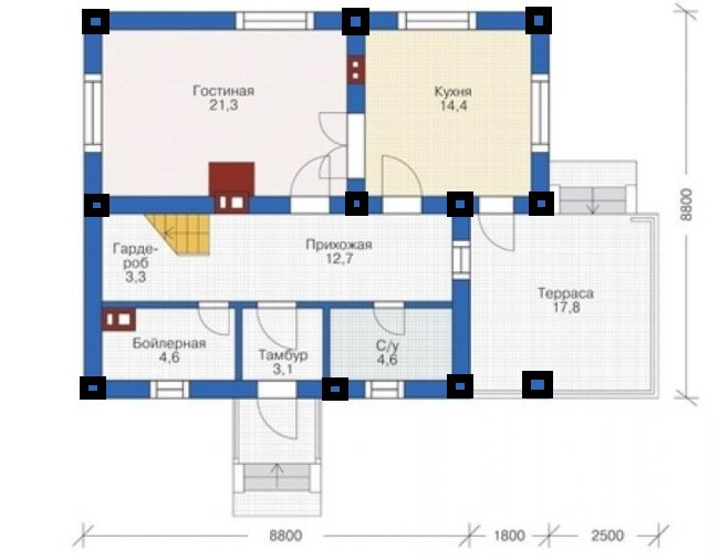 На первом этаже дома расположена терраса 18 м кв, просторная и светлая кухня 14,4 м кв, просторная гостиная 21,3 м кв, холл, санузел 4,6 м кв, гардеробная, бойлерная и тамбур.