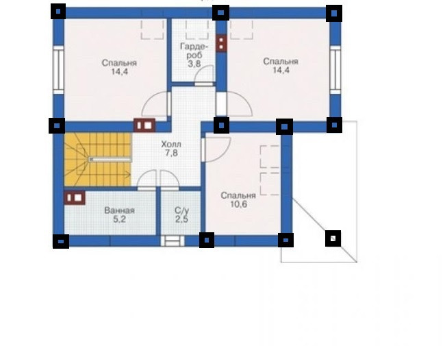 На втором этаже расположились 3 спальни 14,4, 14,4 и 10,6 м кв. соответственно, туалет 2,5 м кв, просторная ванная 5,2 м кв гардероб и холл.