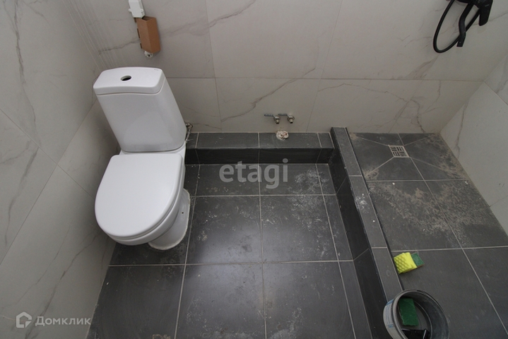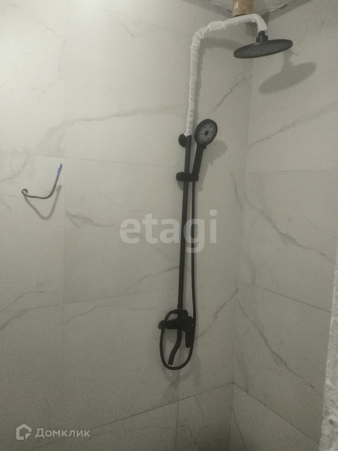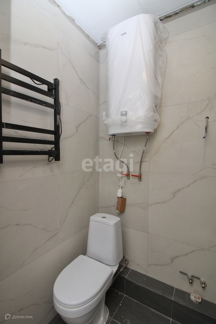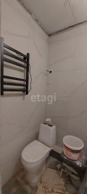 В ванной: плитка, электронагреватель, душевая лейка, поддон, унитаз, полотенцесушитель.