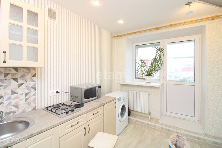 В кухне: ремонт делался в 2021 год: обои, натяжной потолок, 6 встроенных лампочек, шкафчики, плитка газовая двухкомфорочная, холодильник, стол, табуреты.