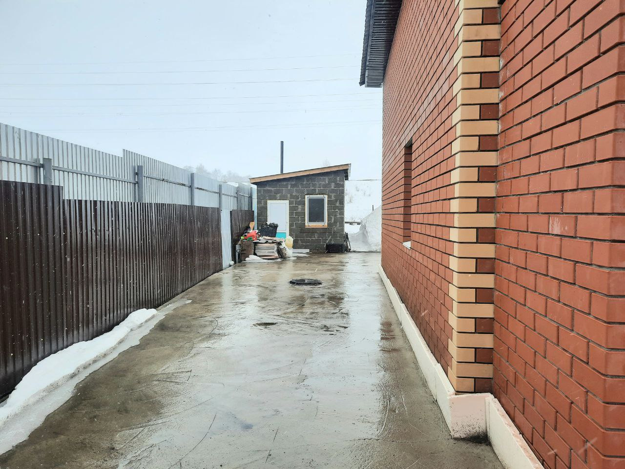 Территория огорожена забором, бетонная дорожка.
