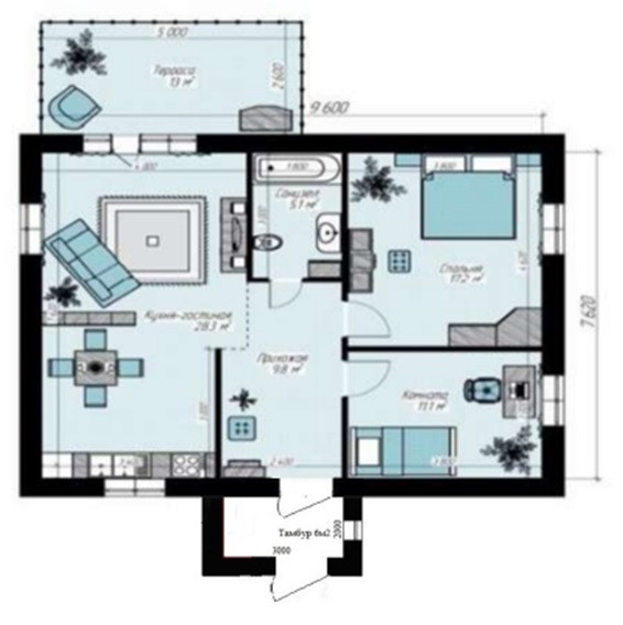 Гостиная-кухня, 2 спальни, санузел, тамбур и прихожая.