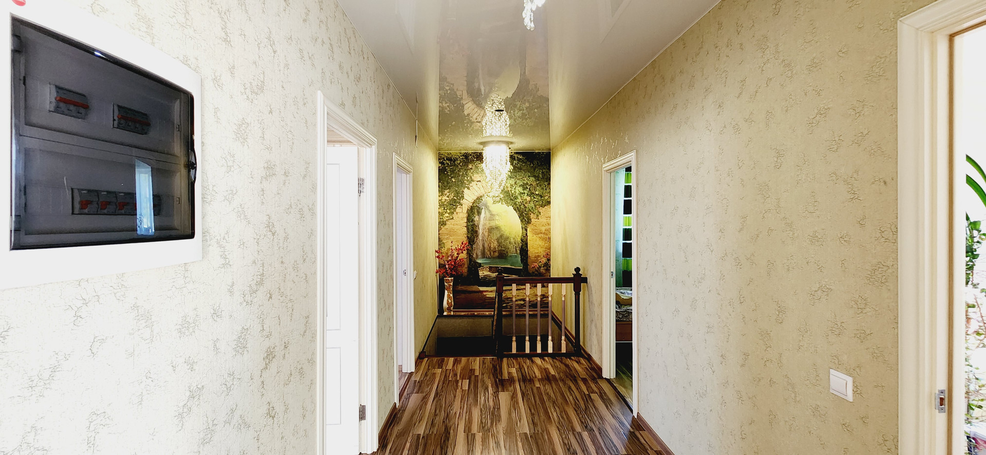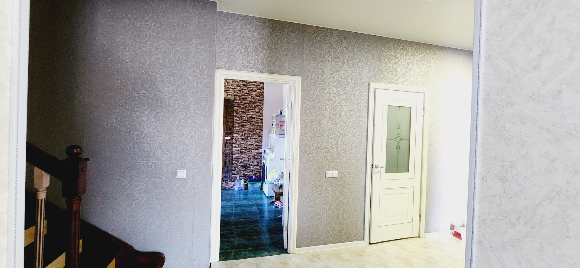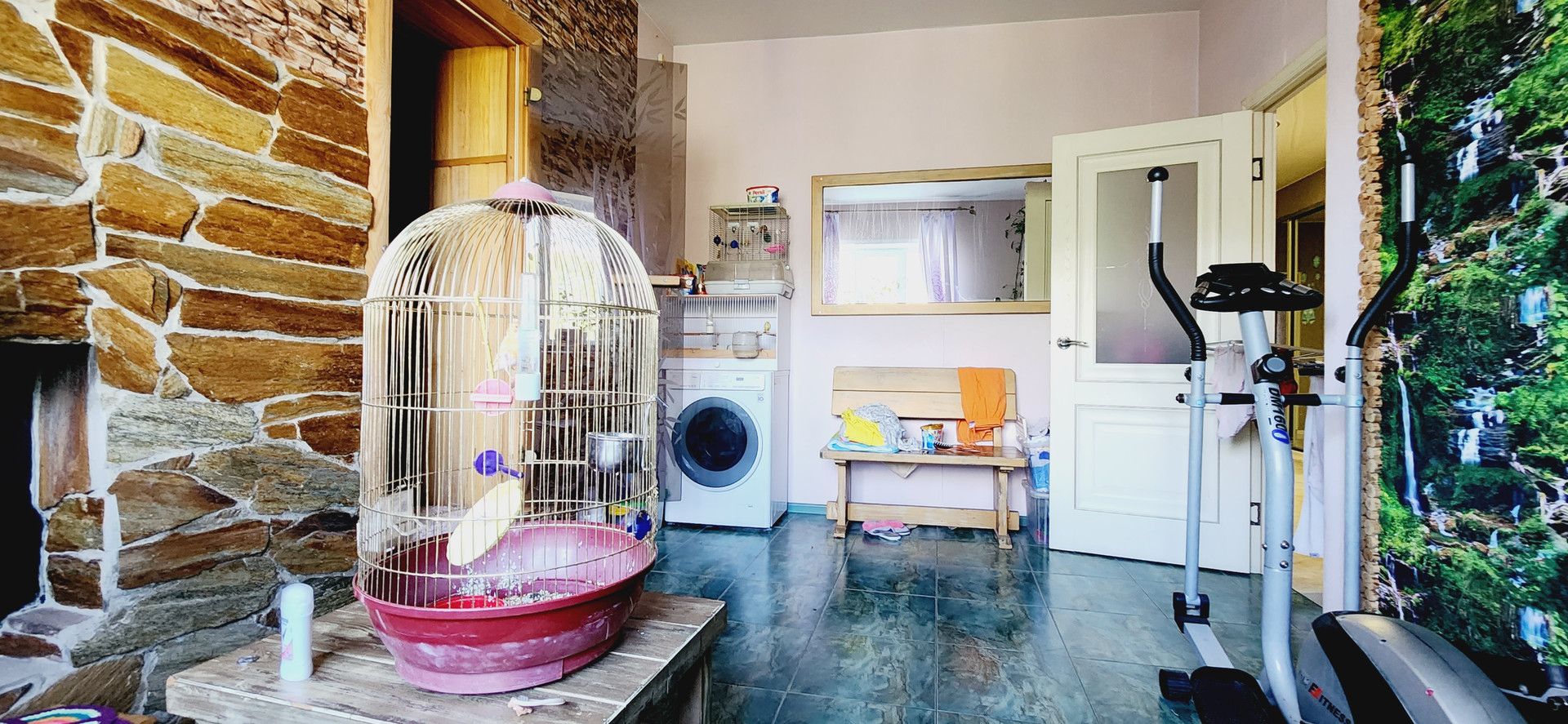 Полы на первом этаже: в гостиной и коридоре сделаны из качественного ламината под имитацию кафельной плитки. В каминной комнате, бане и сан узле полы выложены плиткой. Весь пол первого этажа теплый! Натяжные потолки!