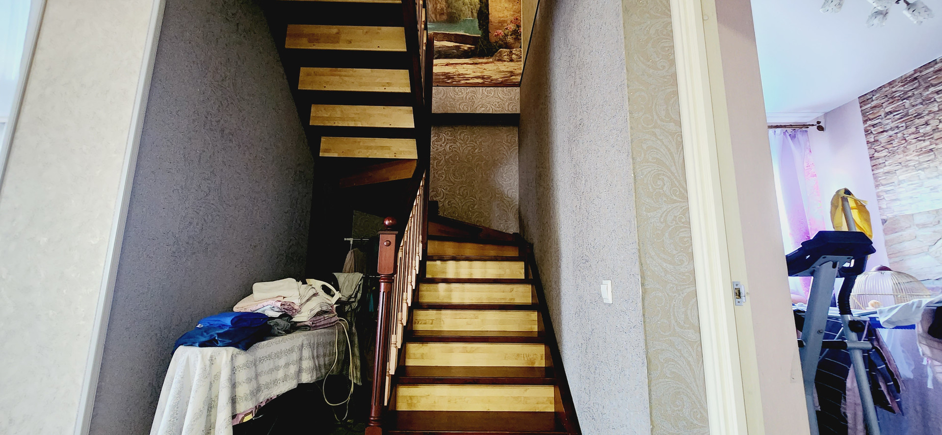 На второй этаж ведет винтовая деревянная лестница.