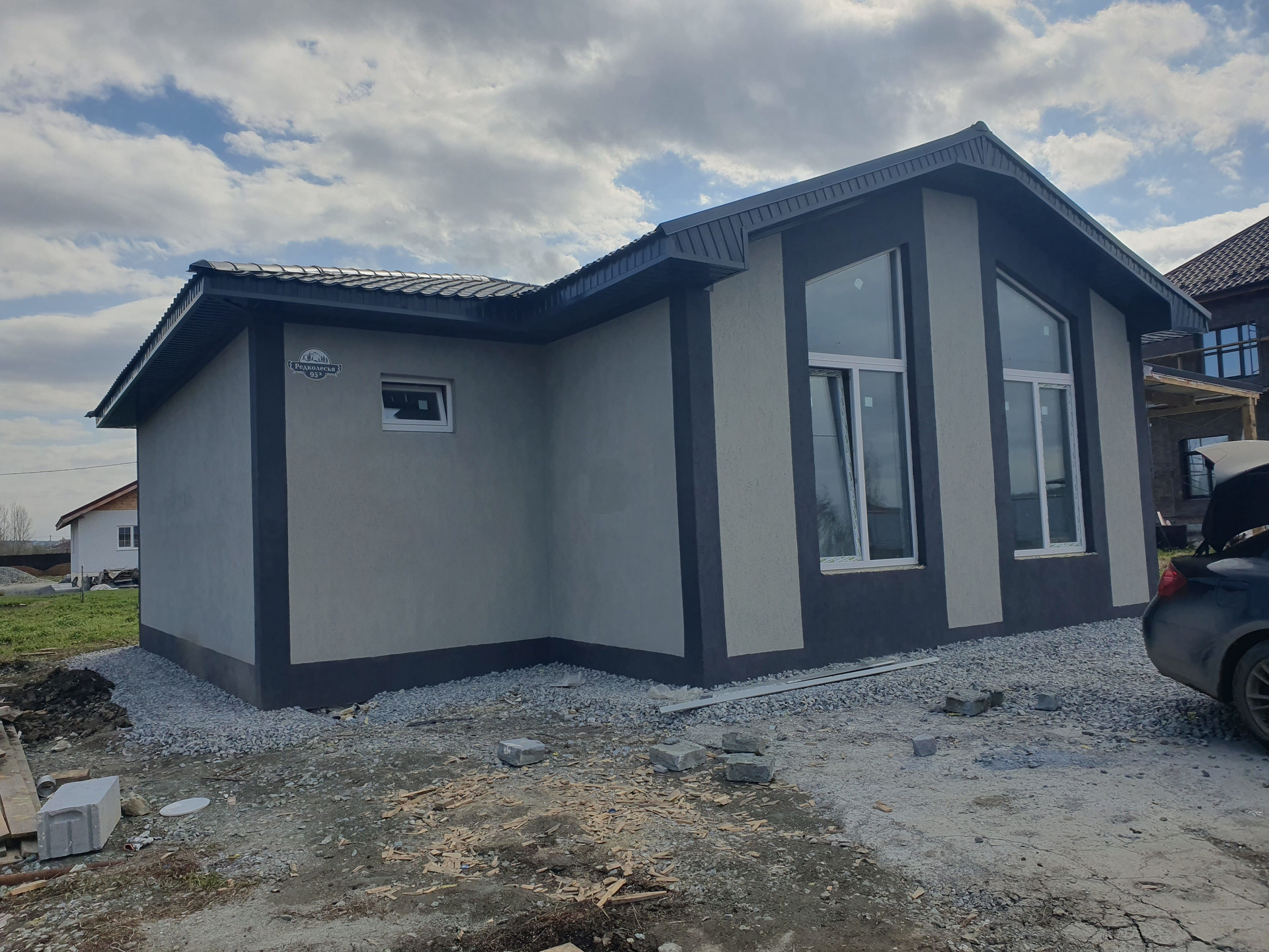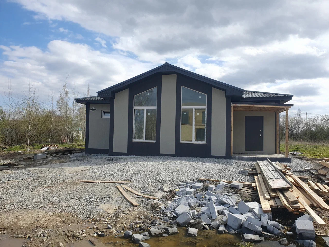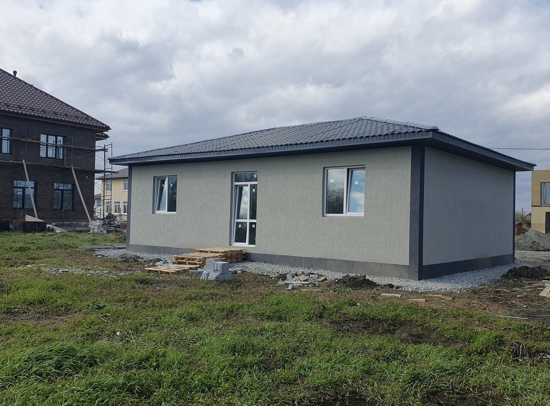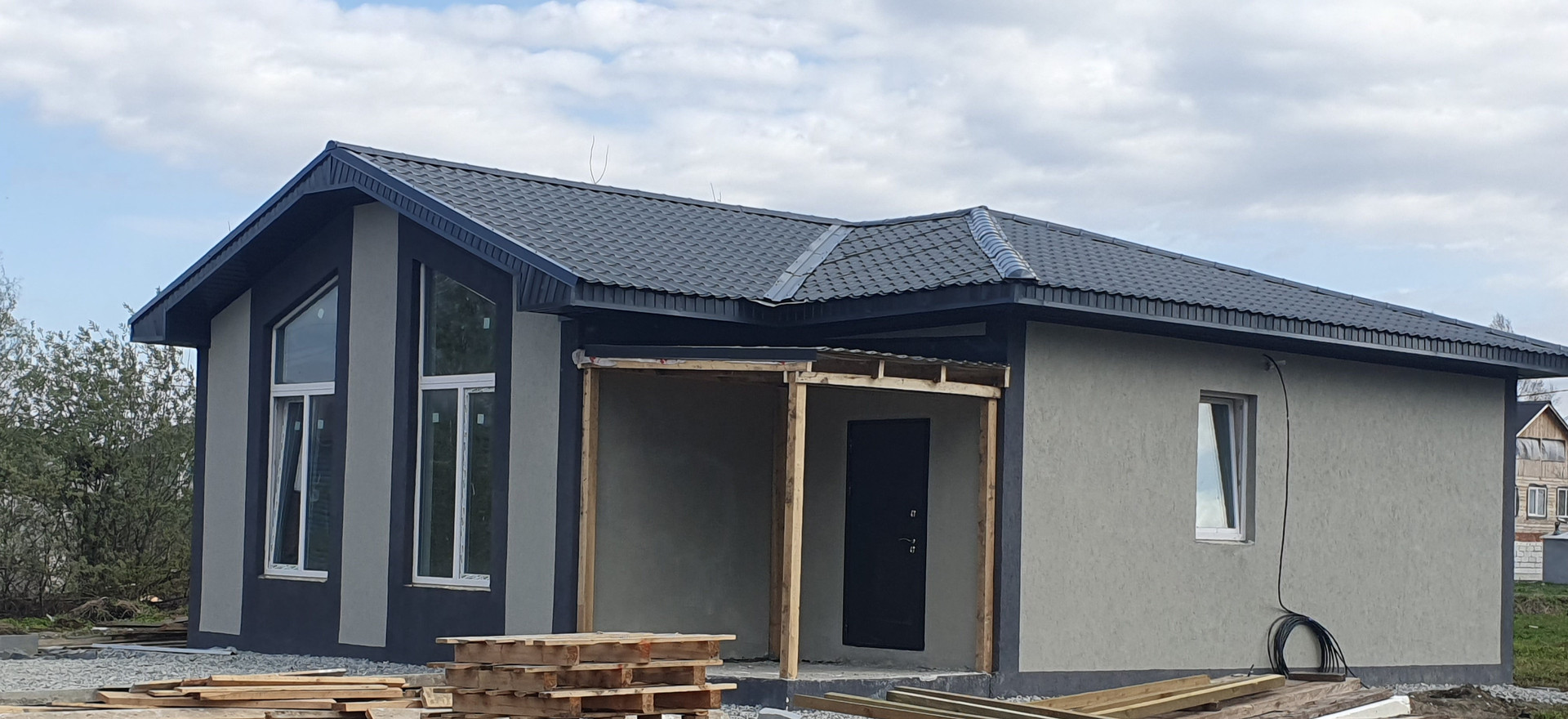 Газоблок 250 см, фундамент — утепленная монолитная плита на 25 сваях глубиной 3 метра, дверь с терморазрывом, окна 70-й профиль, 5-камерный. Фасад — каменная вата 50 мм, штукатурка «Кароед» с возможностью перекрасить дом в любой цвет. Кровля — холодный чердак, утепленный каменной ватой 20 см, металлочерепица Монтерей.