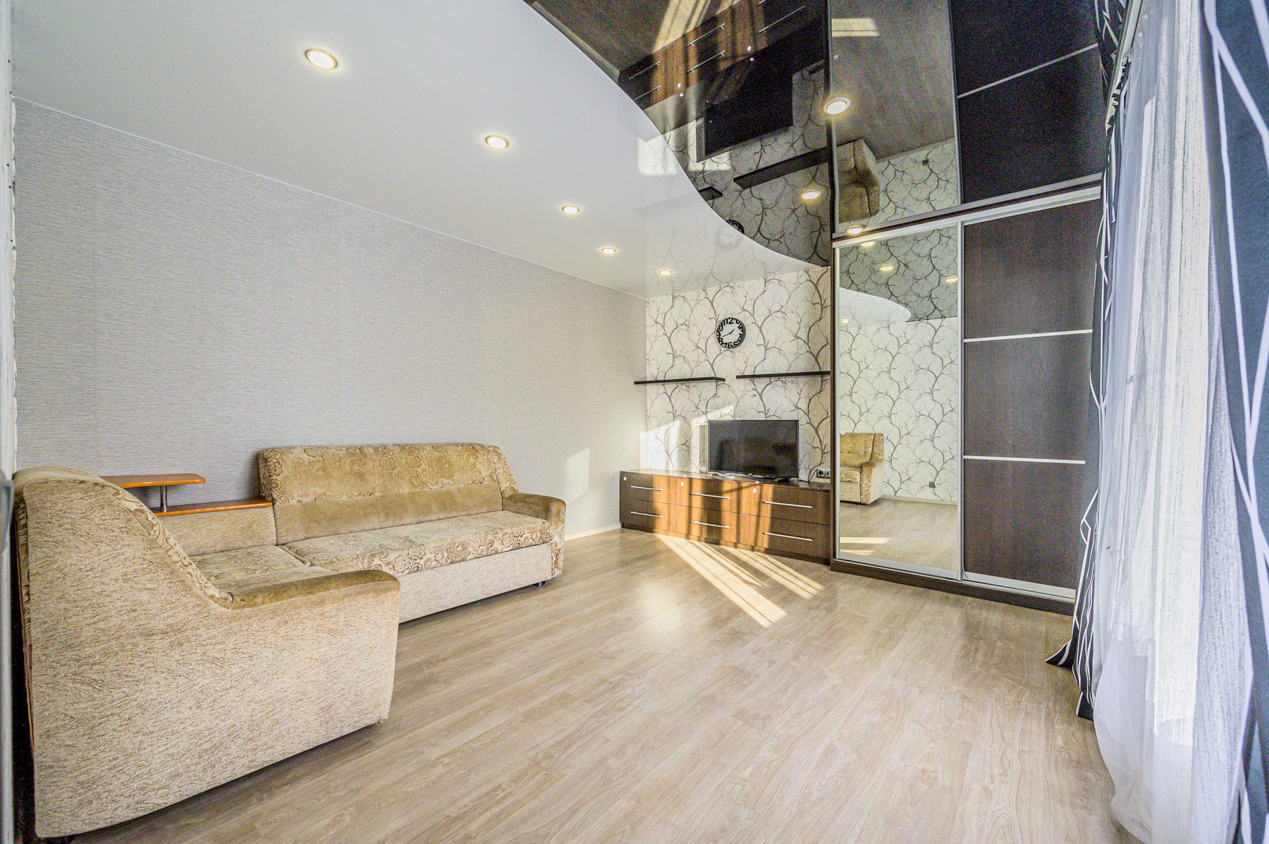 На 1 этаже находятся прихожая со шкафом-купе, кухня-гостиная, оборудованная встроенной мебелью и техникой, большой санузел с акриловой ванной и гостевая спальня.
