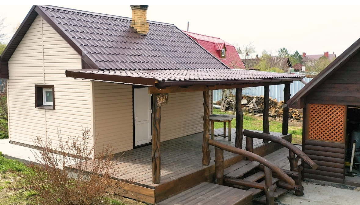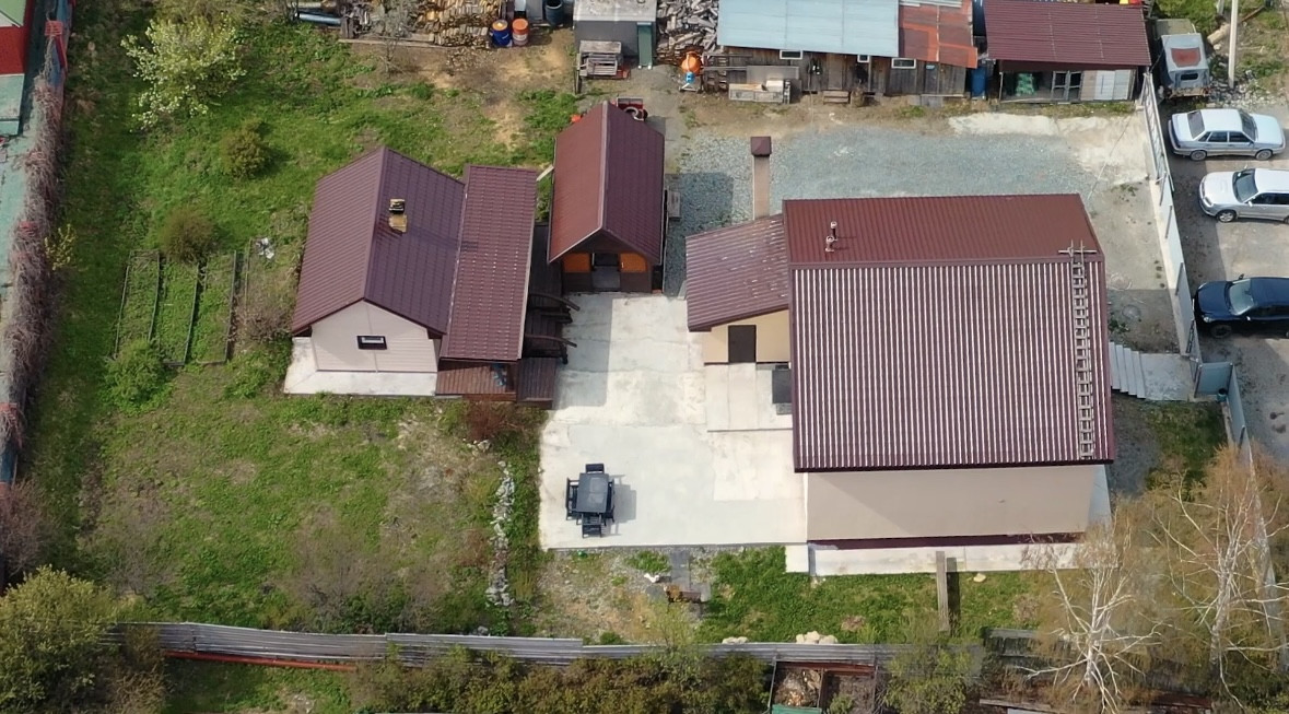 Участок огорожен забором из профнастилом, въезд через откатные ворота. На нем несколько хозпостроек, беседка, мангал и баня с комнатой отдыха и парилкой.