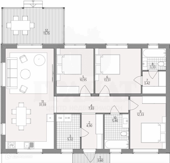 - спальни: 13 м2, 13 м2, мастер-спальня 12 м2 с санузлом 4м2 и гардеробной, гостиная 32 м2, основной санузел 6 м2 и котельная.