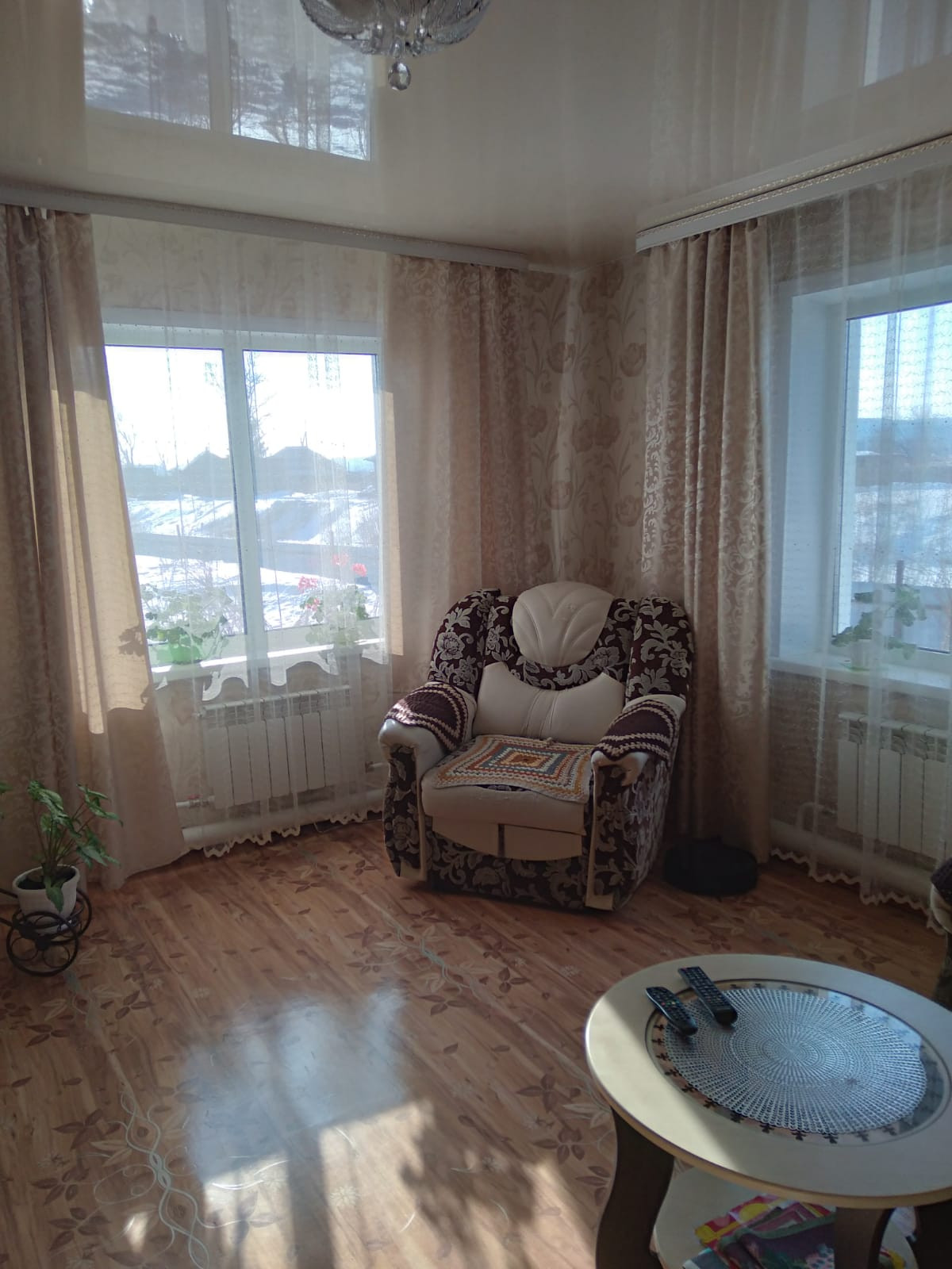 Бревенчатый, теплый дом  64 кв.м, земля 15 соток на берегу речки, 3 комнаты, арки, большая веранда, ремонт пластиковые окна везде, натяжные потолки, лестница на крышу с веранды в большое сухое помещение. Сан.узел в доме, душевая кабина, вода- своя скважина, печное отопление, радиаторы, гараж на 2 машины, баня большая, оббита реечкой новая.Плодовые посадки: смородина, малина, черноплодная рябина, полукультурки и другое. Все огорожено забором.  Все в отличном состоянии ухоженное.
