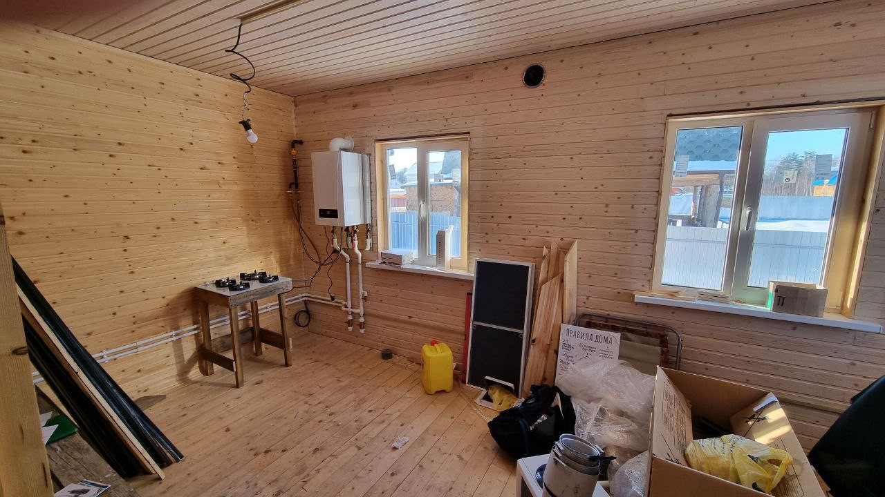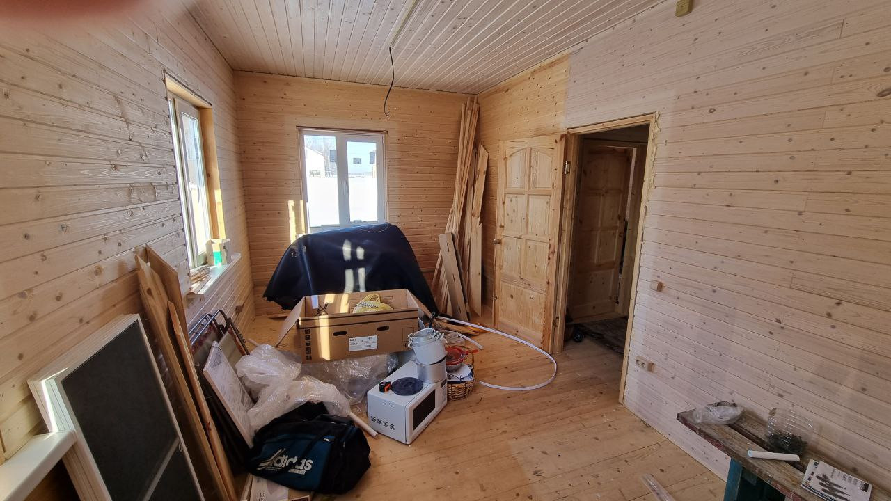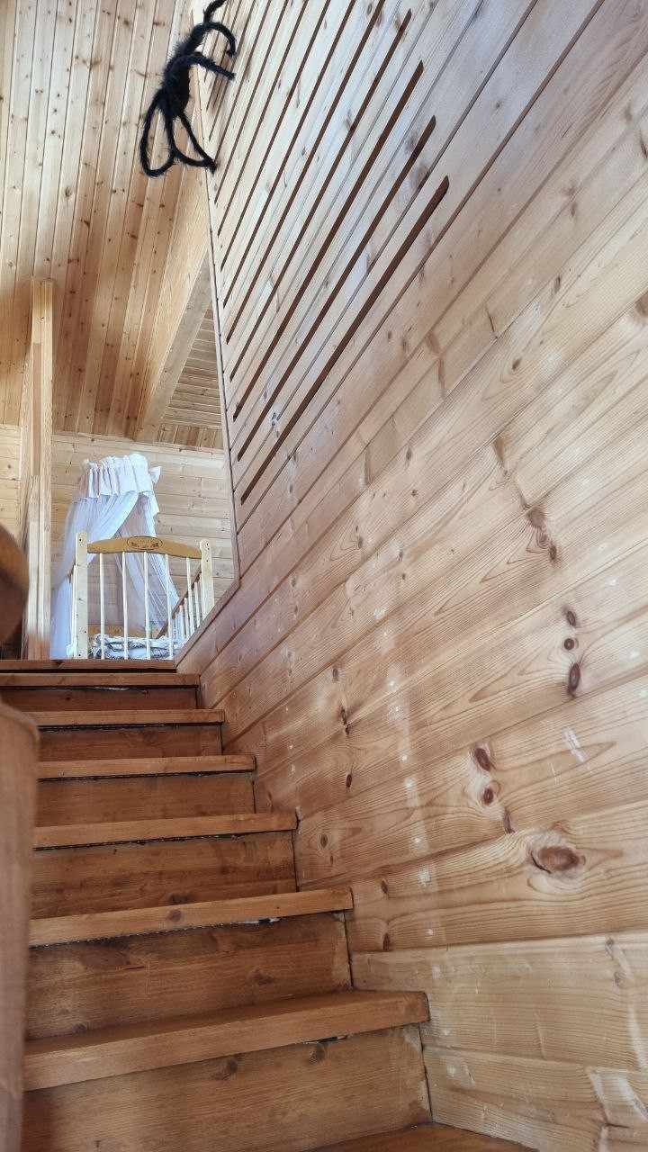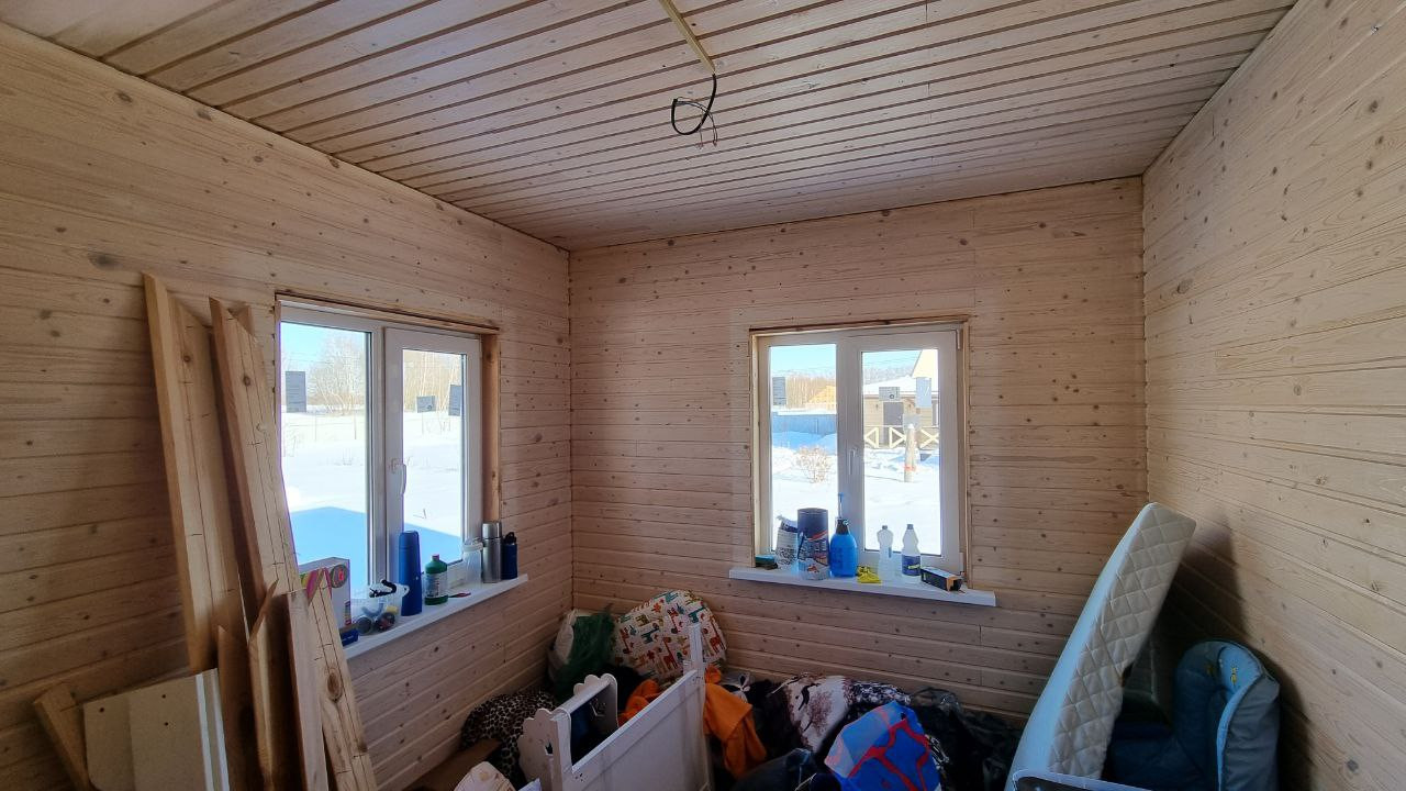 Утепление дома по кругу 200, стены обшиты имитацией бруса, потолок евровагонка
