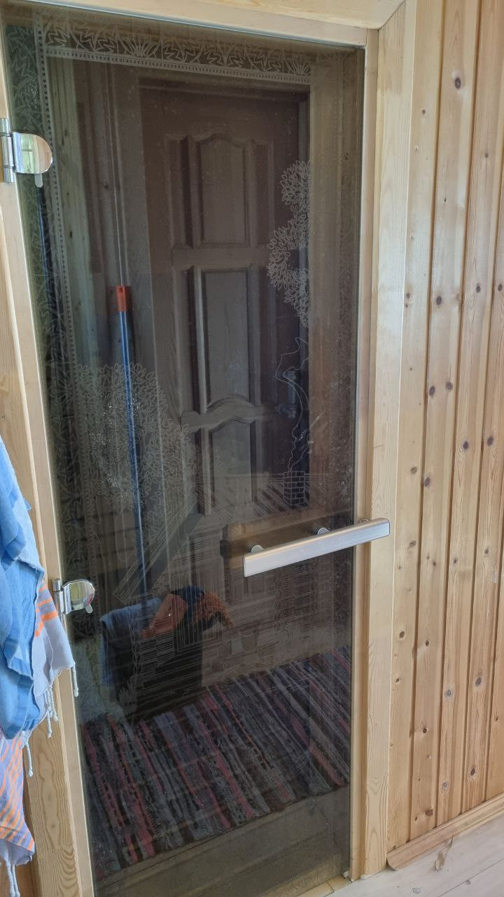 Обшивка липа, дверь стеклянная, полки изготовлены из африканского абаша