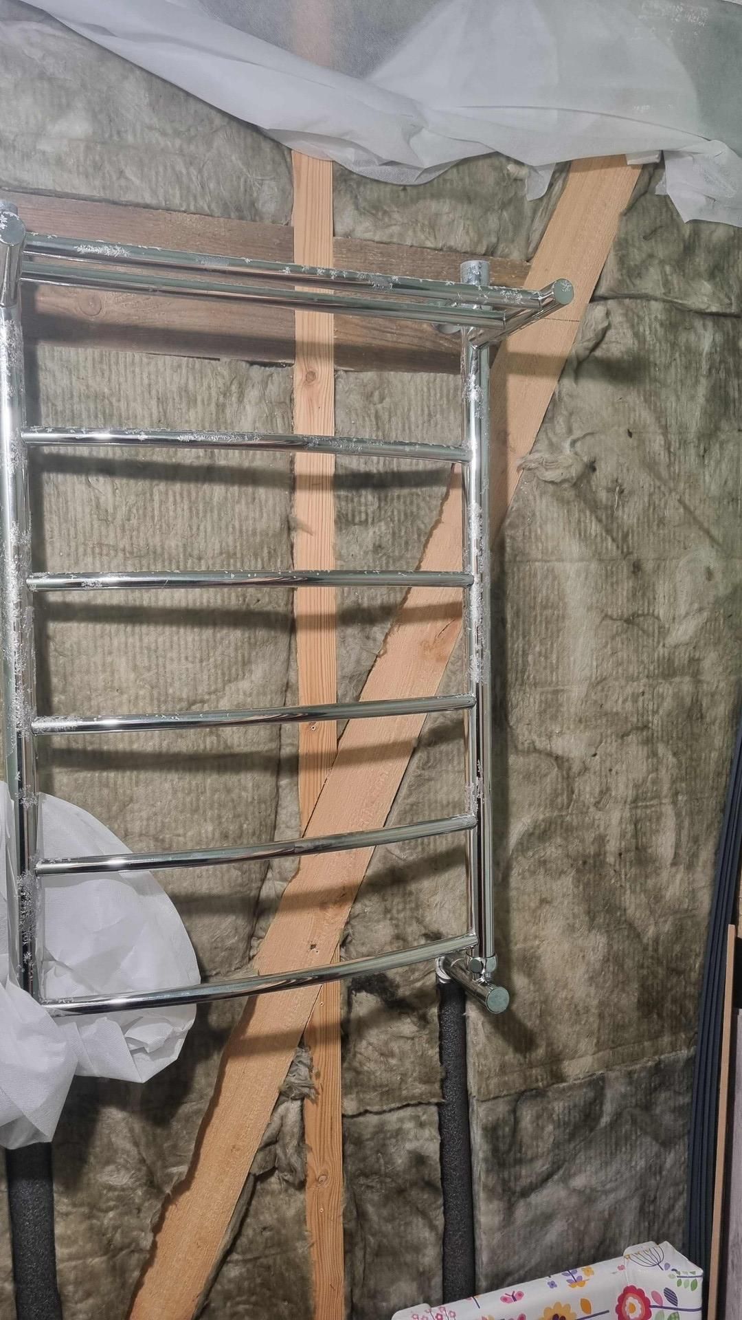 В санузле повесили полотенцесушитель.