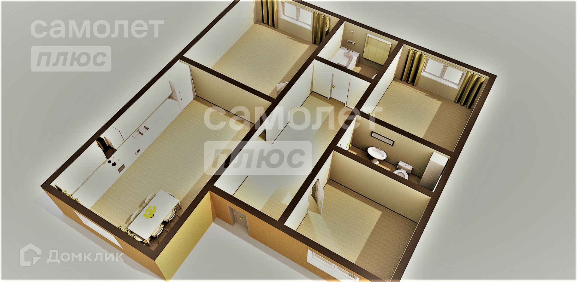 -  кухня-гостиная 33,8 кв.м. и 3 комнаты, сан. узел раздельный