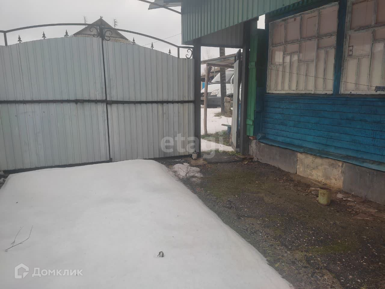 Двор огорожен, к дому подходит асфальт.