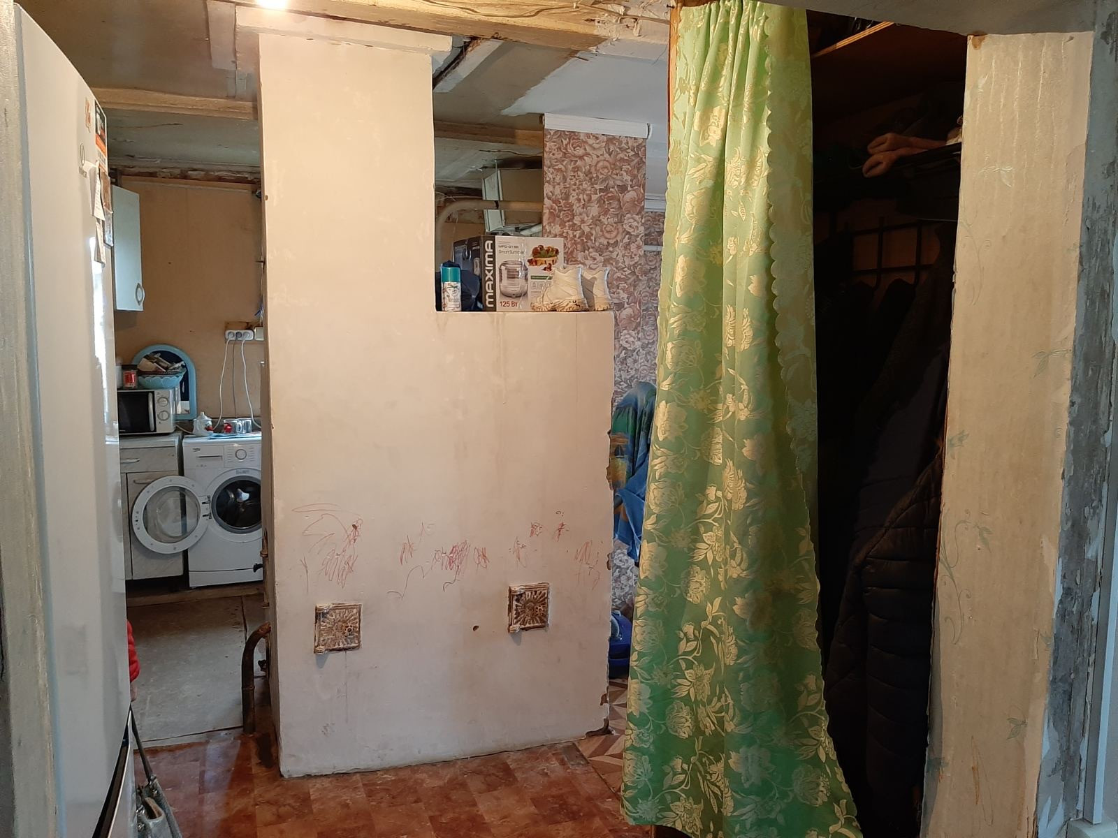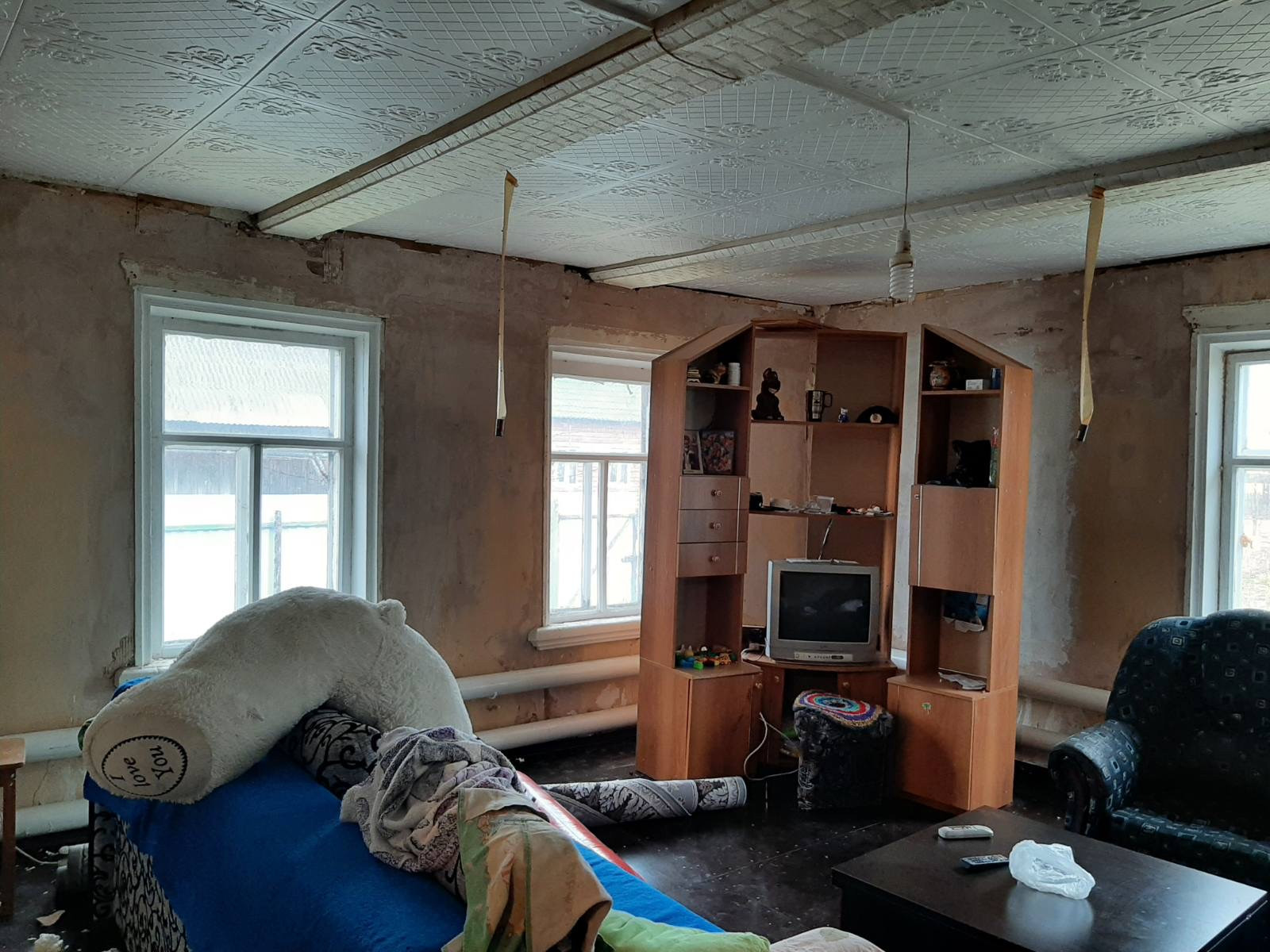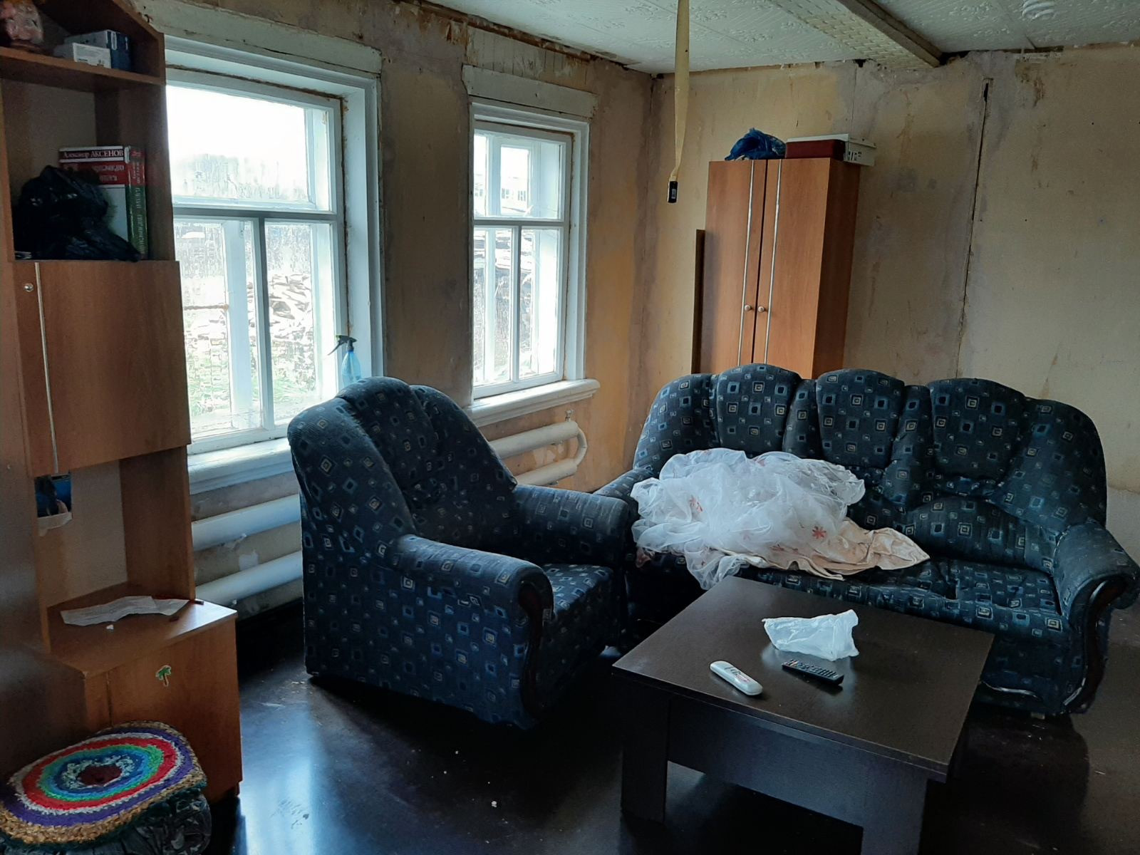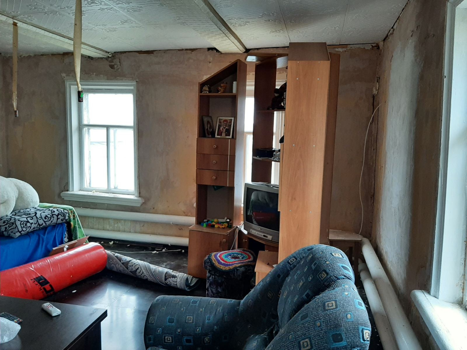 Дом бревенчатый, просторный: 2комнаты  + 1большая, печное-электро отопление, ц/вода, канал.(слив), окна простые, пол-ламинат, стены-фанера, обои. Участок 20сот.и более, баня. Земельный участок  можно размежевать  на 2 отдельных.