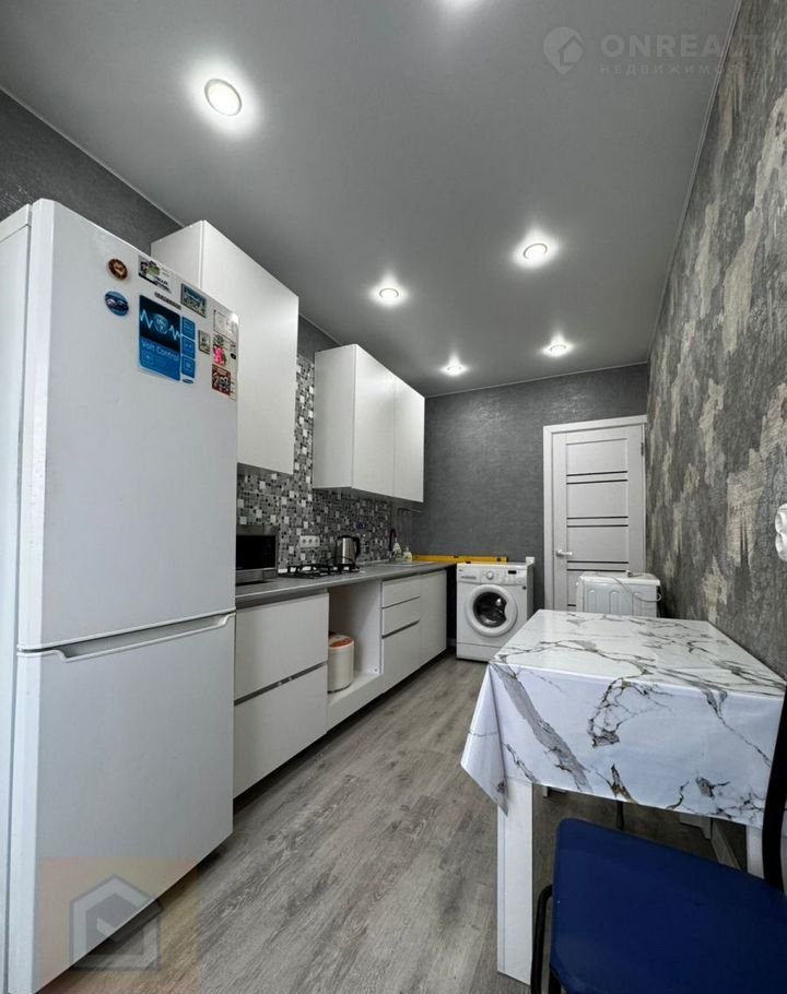 Установлена новая мебель на кухне, холодильник, варочная панель, стиральная машина.