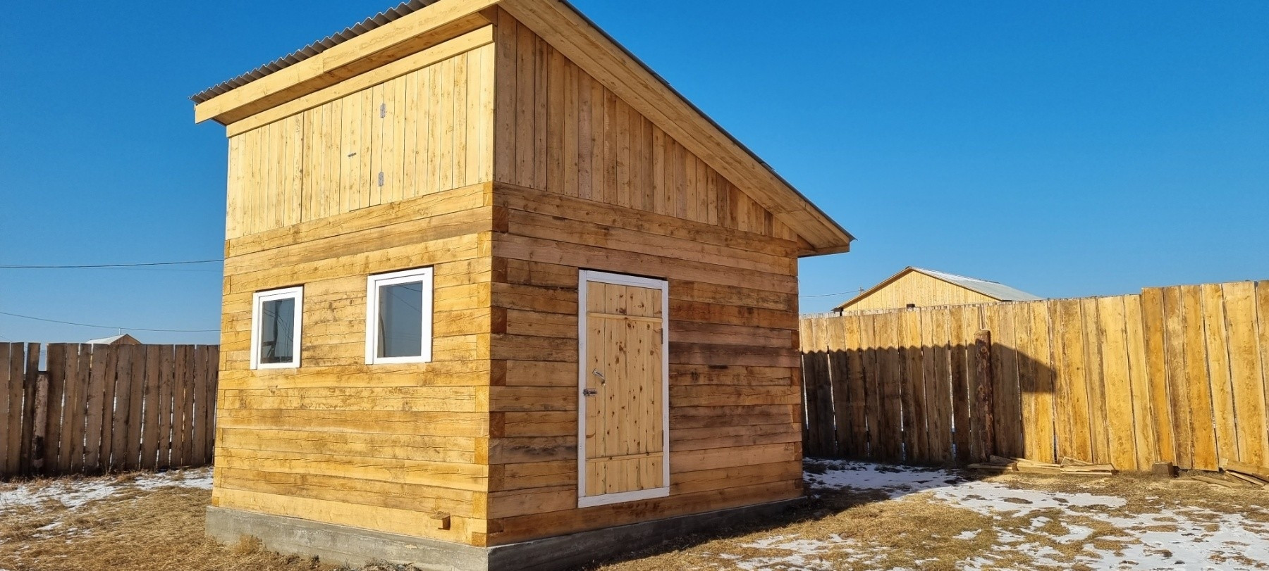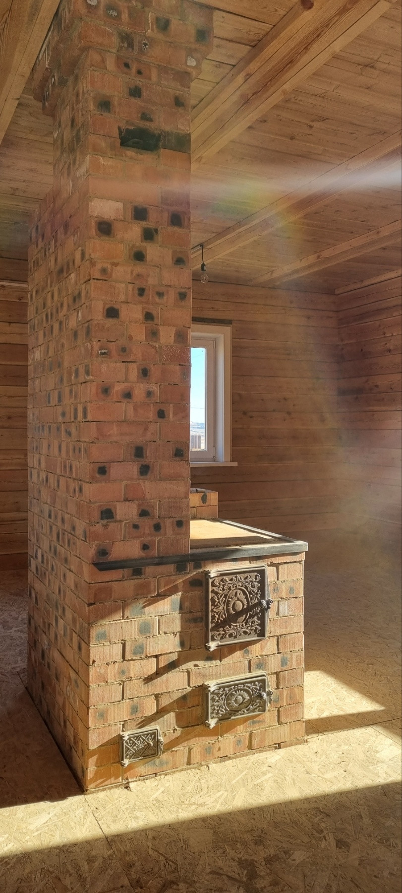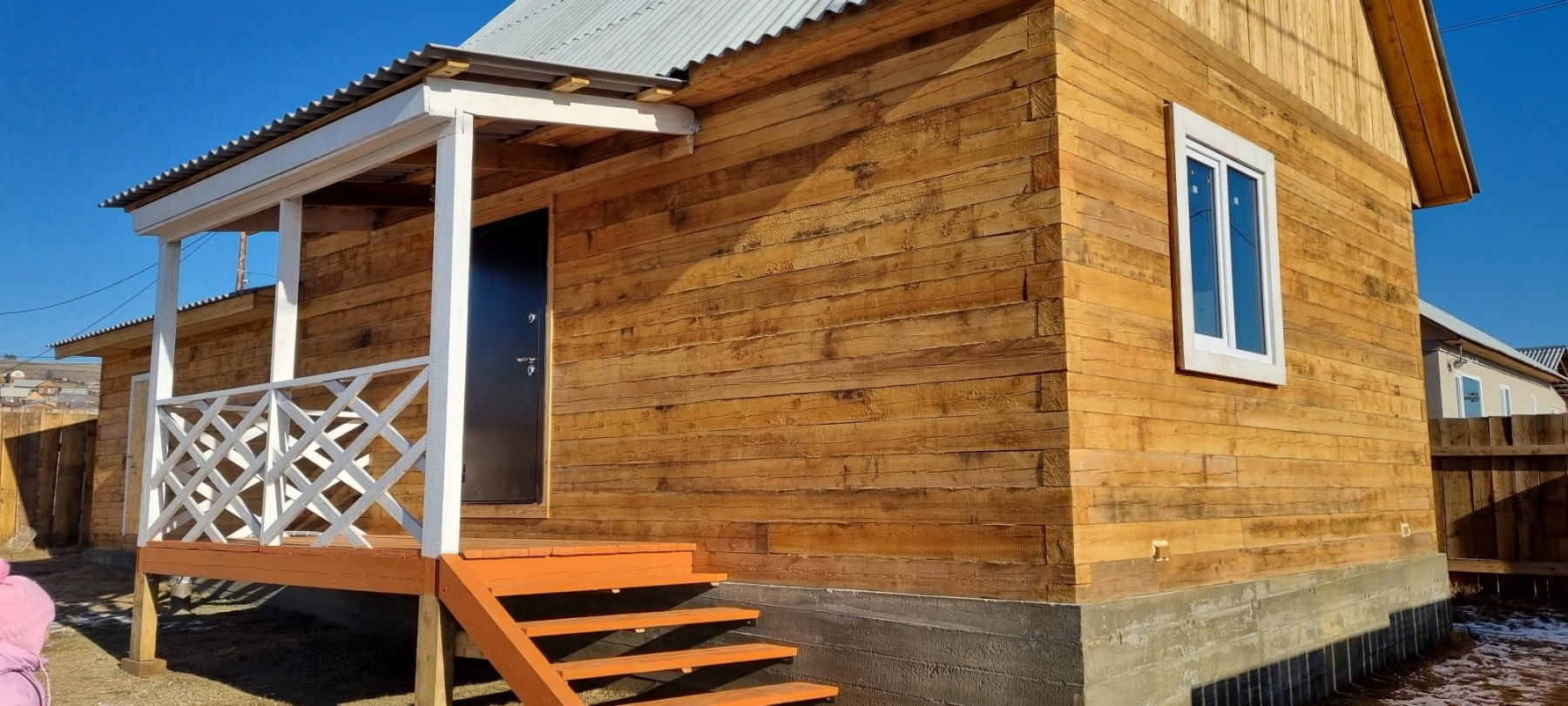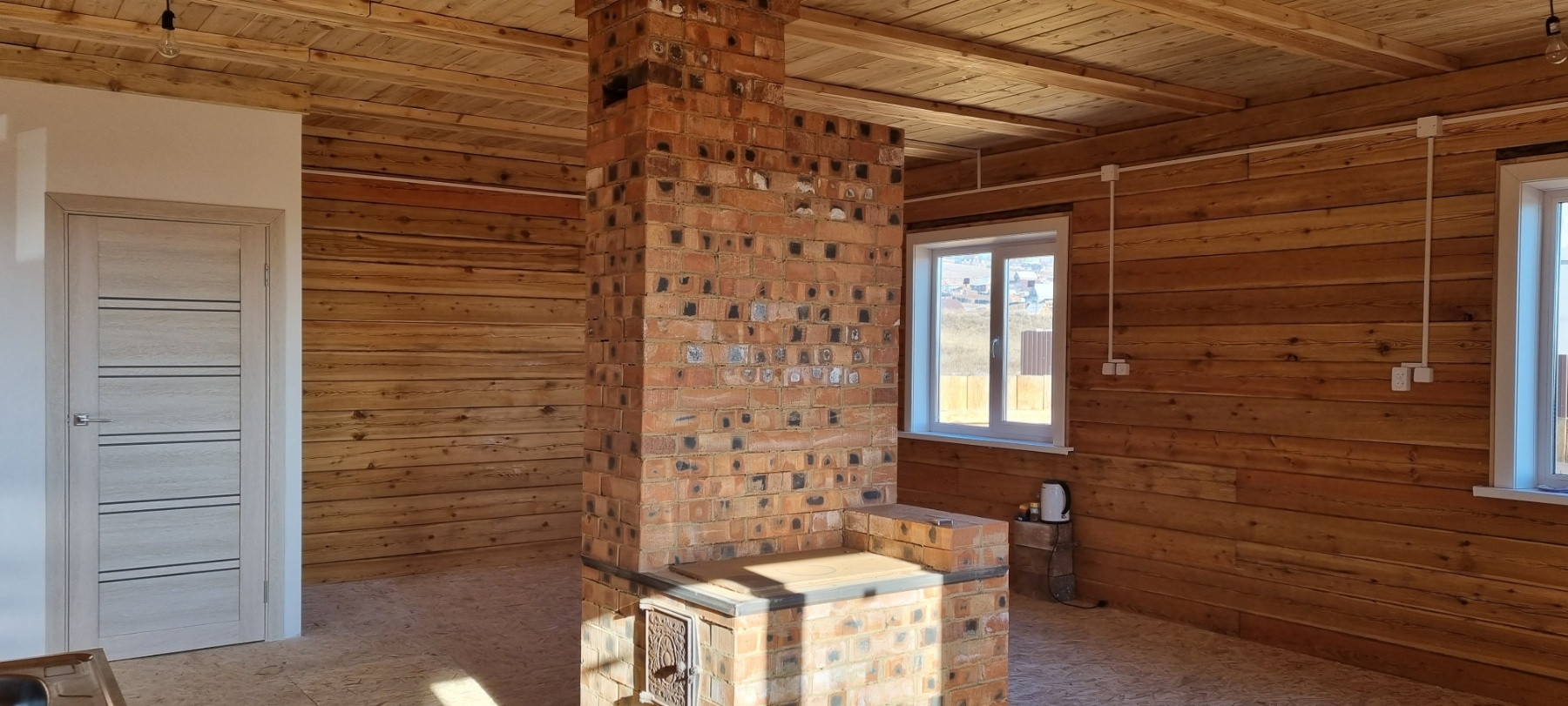 Дом 6×8 из бруса 18х18, установлены 5 камерные окна и входная утепленная металлическая дверь, стены оструганы и покрыты лаком. В дом заведена вода, скважина на 45 метров, установлен сан узел, подведена вода в кухню, септик на 3 кольца, свет (на 380 вольт) разведен по всему дому, печное отопление.