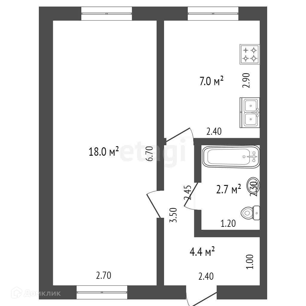 Комната 18,0 кв.м, кухня 7,0 кв.м, санузел совмещённый 2,7 кв.м, высота 2,8 м.
