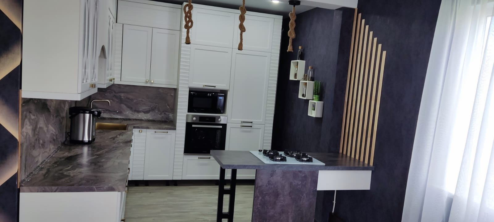 На 1 этаже большая, уютная ванная комната (место отдыха), сан. узел, котельная(прачечная, кладовка), открытый, светлый зал 4 окна и огромная кухня мечта каждой хозяйки. В зале и кухне завершили ремонт в сентябре этого года. Интерьерная, новая кухня от А до Я с заменой полностью всей техники.