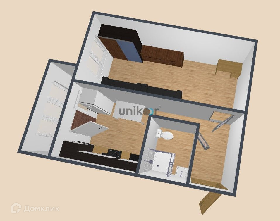 Планировка: Коридор (6,1 кв. метра), совмещённый сан/узел (3,0 кв. метра), просторная кухня (7,9 кв. метра) с выходом на остекленную лоджию (3,0 кв. метра), огромная спальная комната (17,2 кв. метра).