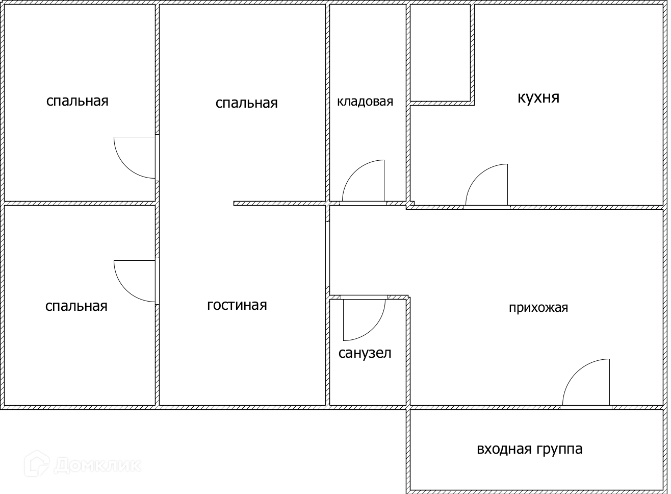 Входная группа, просторная кухня, бойлерная, три спальные комнаты, большая гостиная, кладовая, санузел.