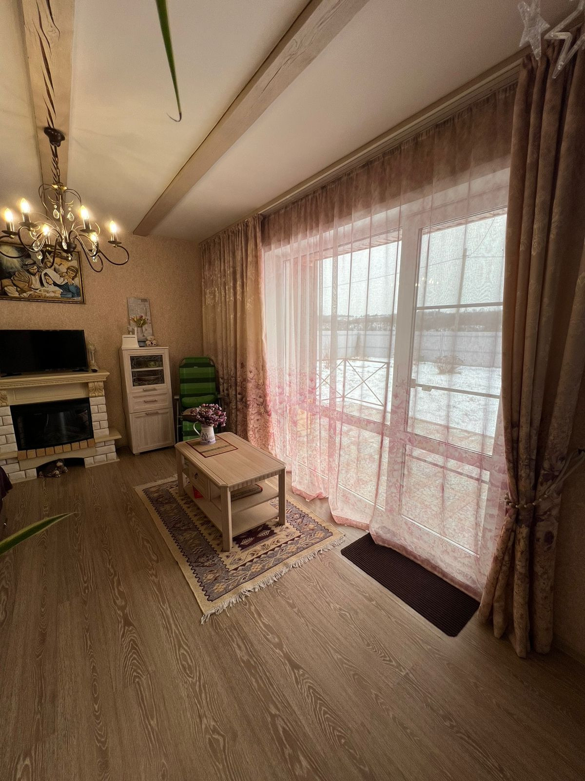 В гостиной - диван, журнальный стол, электрокамин, телевизор, горка.