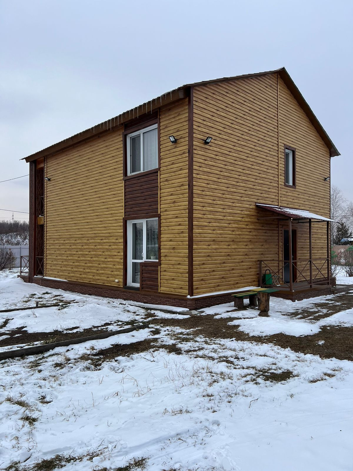 Материал стен - пенополистиролбетон, утепление - базалит 50 мм, отделка фасада - металлосайдинг «корабельная доска».