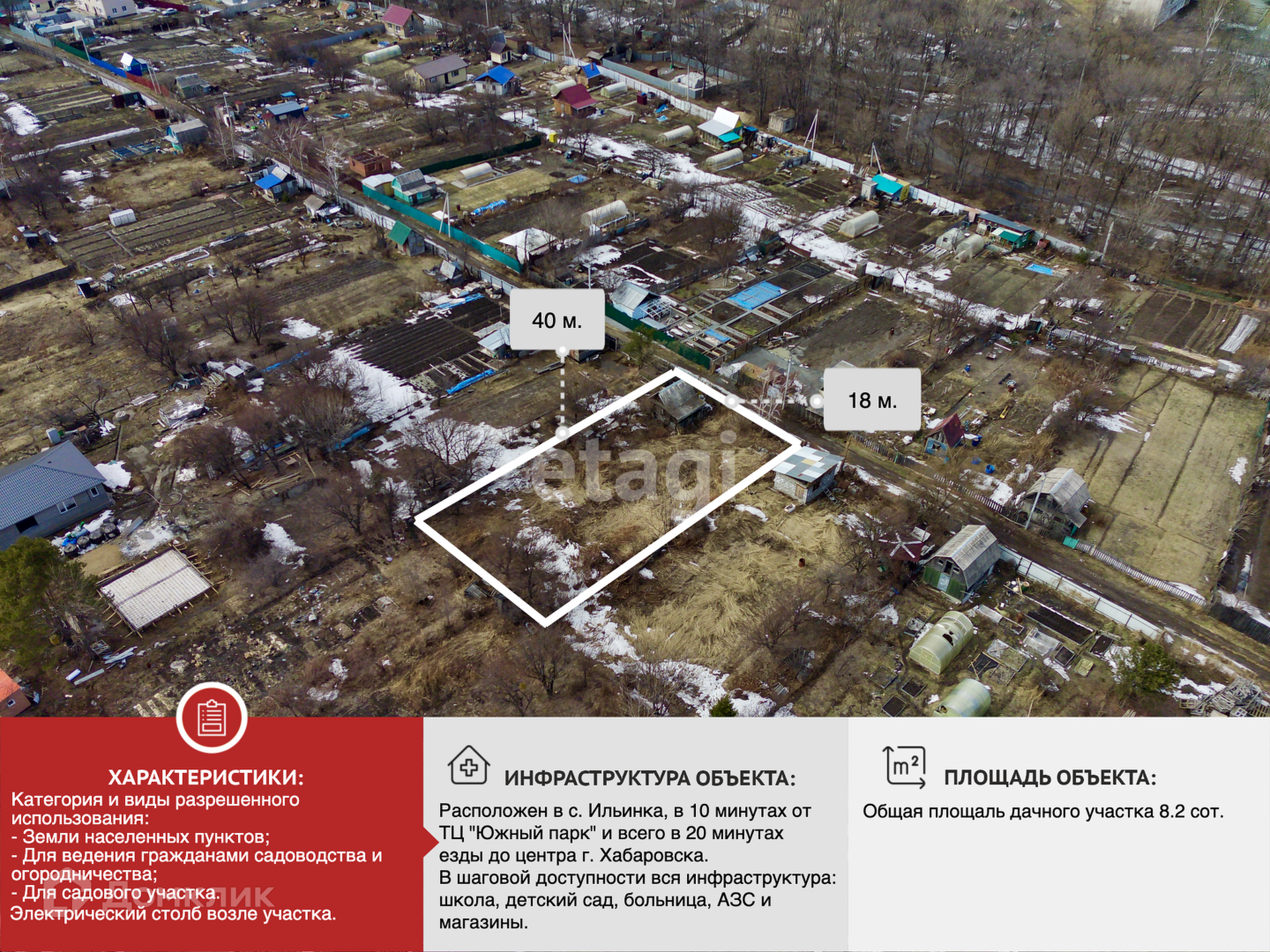 Продается отличный земельный участок в СДТ Сакура расположенный в с. Ильинка, в 10 минутах от ТЦ Южный парк и всего в 20 минутах до центра г. Хабаровска. Общая площадь дачного участка составляет 8,2 соток.