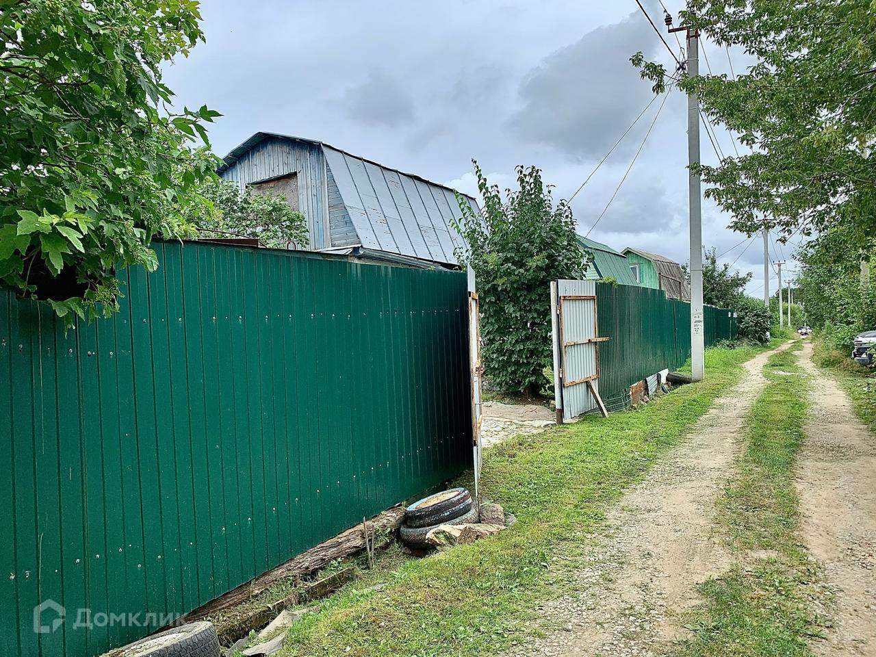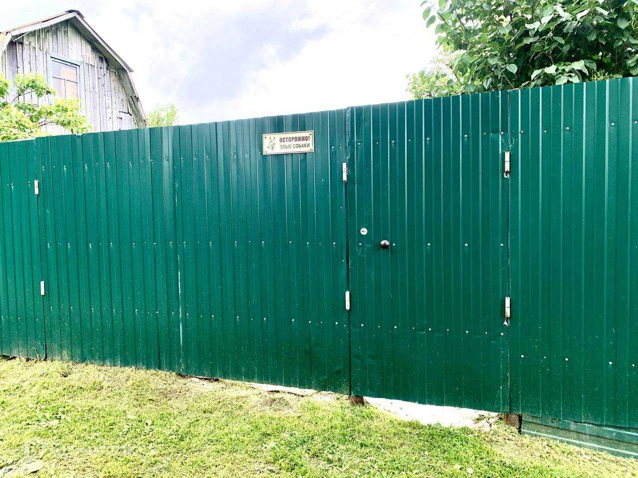 Дача 6 соток огорожена с фронтальной стороны забором из профлиста высотой 2 метра с калиткой и распашными воротами, по остальным сторонам огорожена забором из сетки-рабицы.