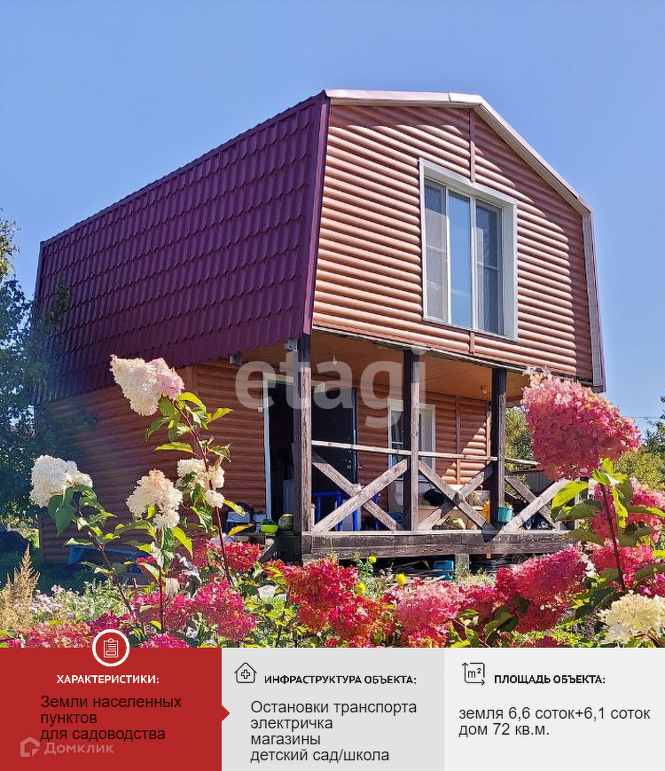 Продается хорошая дача в непосредственной близости к городу. Территория СНТ Механизатор. Земли населенных пунктов, для садоводства. Участок на котором расположен дом - 6,6 соток, прилегает еще один 6,12 соток. В собственности, межевание проведено. Дом 72 кв. м, 2 этажа. Внутри отделан евровагонкой и обоями. На полу линолеум и ламинат. Электричество 380 вольт. Первый этаж из бруса лиственницы 20х20. Весь дом утеплен и обшит металлическим сайдингом. Можно проживать круглый год. В шаговой доступности останови автобуса и электрички, а также вся инфраструктура с. Ильинка. Подходит под ДВ ипотеку и материнский капитал. Номер в базе: 11490043. Район: СНТ Механизатор