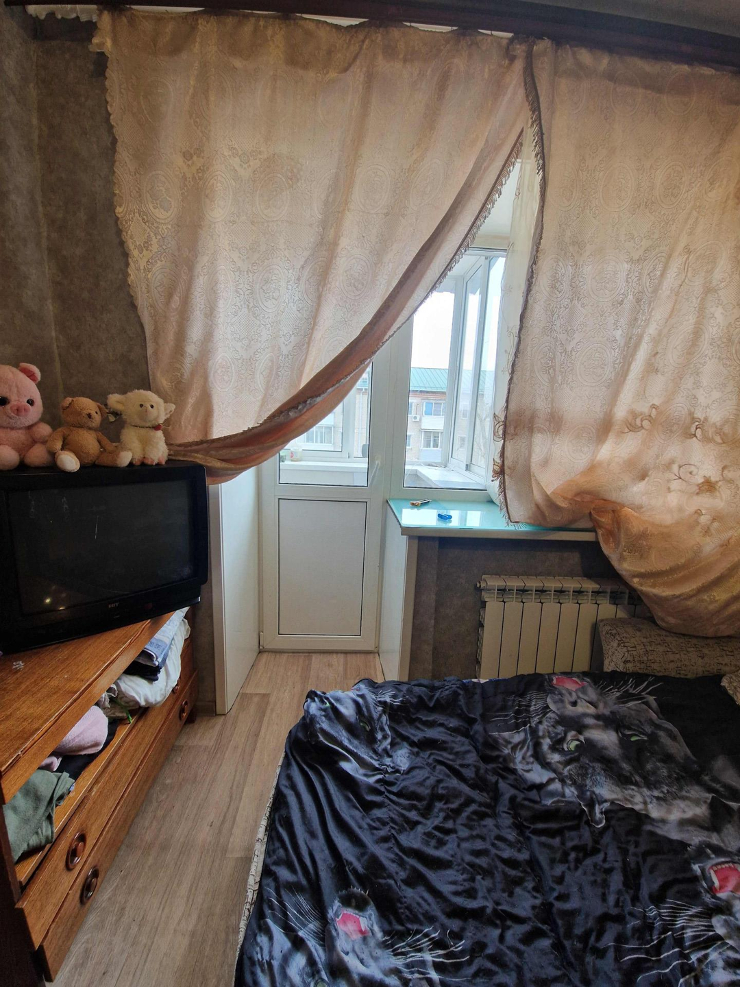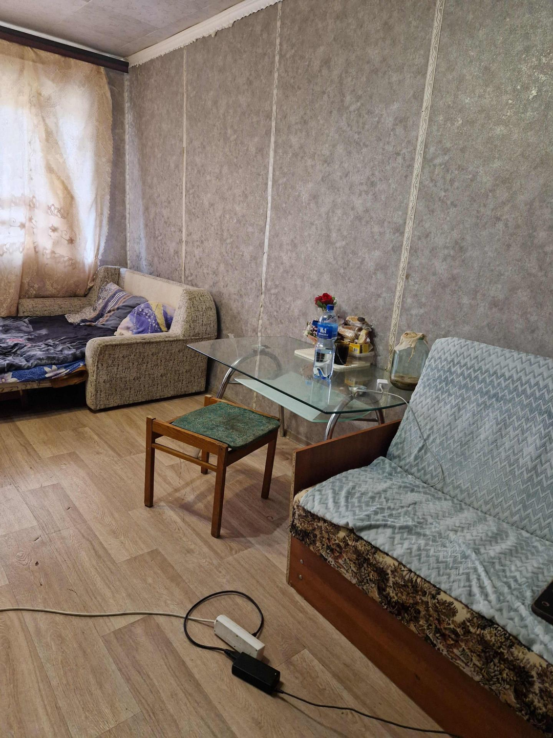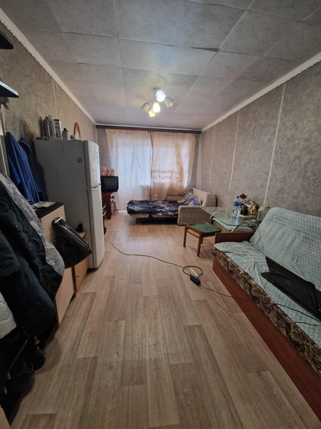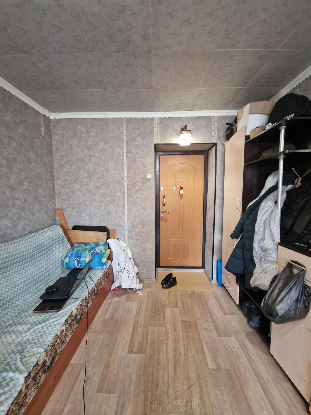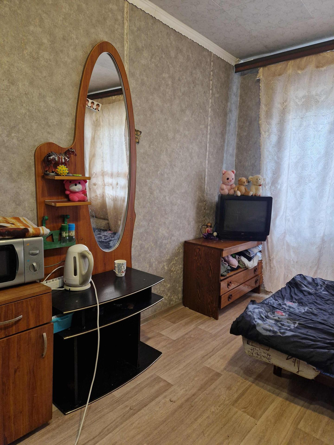Комната в отличном состоянии, на полу линолеум, обои, пластиковое окно, качественная входная дверь.