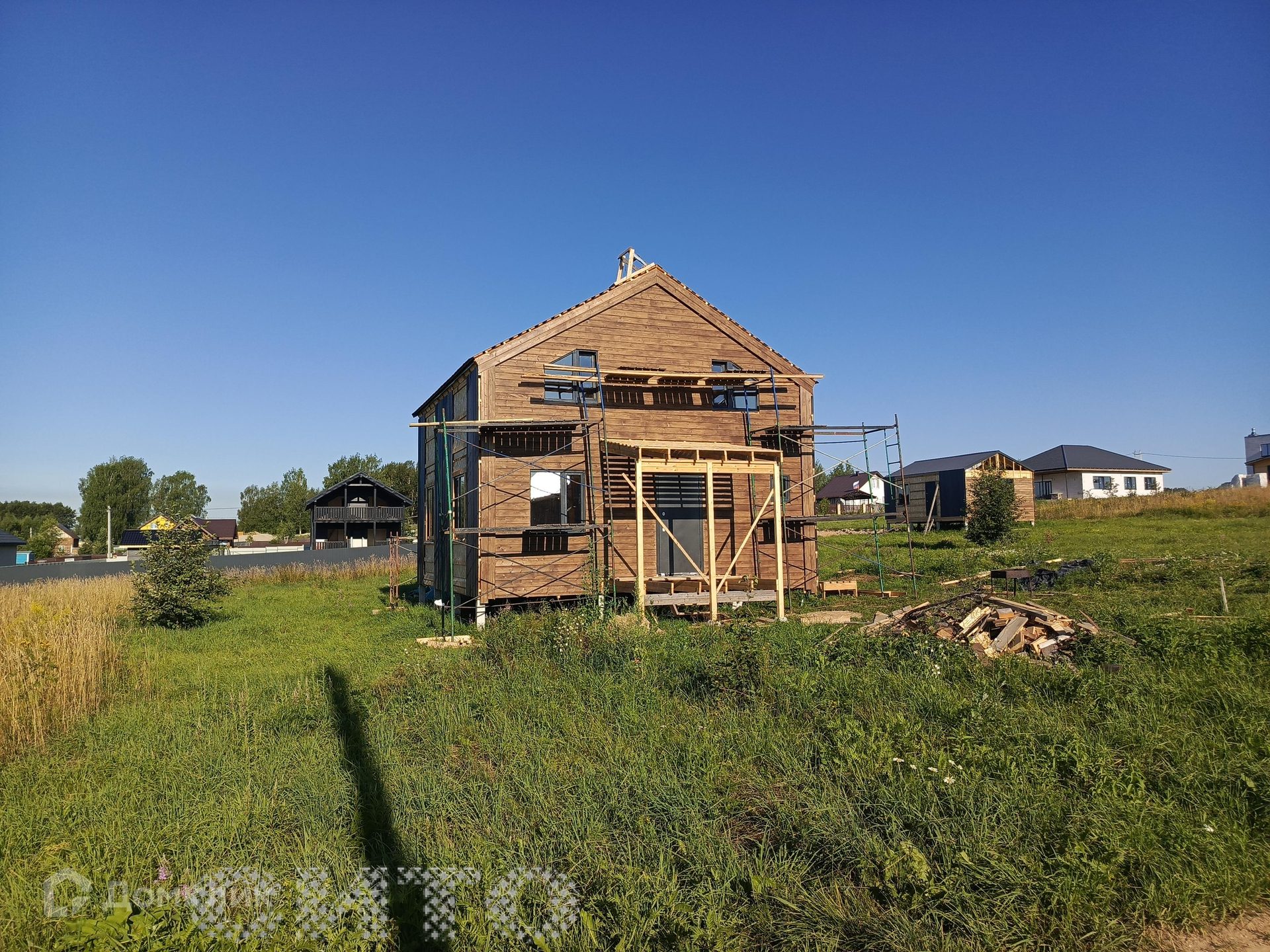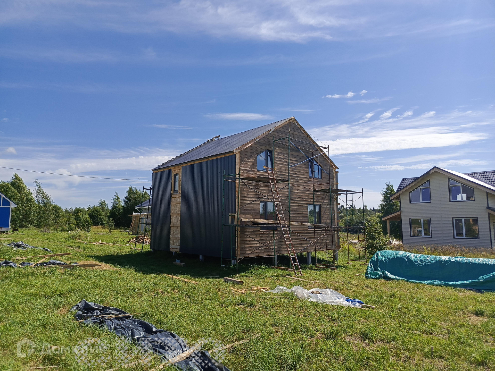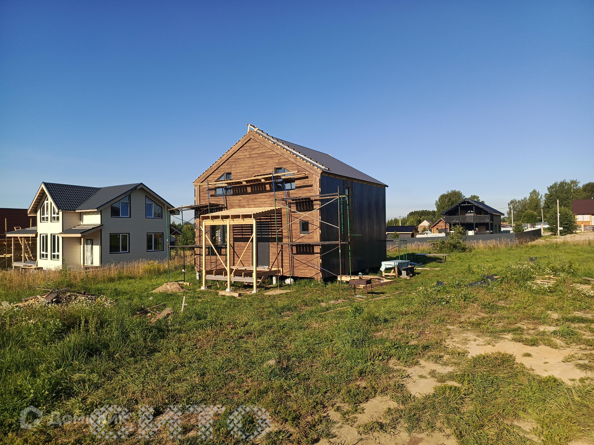 Продаётся участок площадью 10 соток в поселке Ильинское. На участке строится двухэтажный дом площадью 112 квадратных метров. Дом строится из сип-панелей на железобетонных сваях и находится на завершающем этапе строительства. Рядом с участком находится автобусная остановка, продуктовый магазин, пункт выдачи товаров Озон и хозяйственный магазин. Из поселка каждый день отправляется автобус в школу в деревню Домозерово и обратно. Все соседи активно строятся для постоянного проживания. Газ проведен по улице, дорога зимой чистится. Дом предназначен для круглогодичного проживания. На первом этаже расположены санузел, кухня, гостиная и комната. На втором этаже - три спальни и санузел.