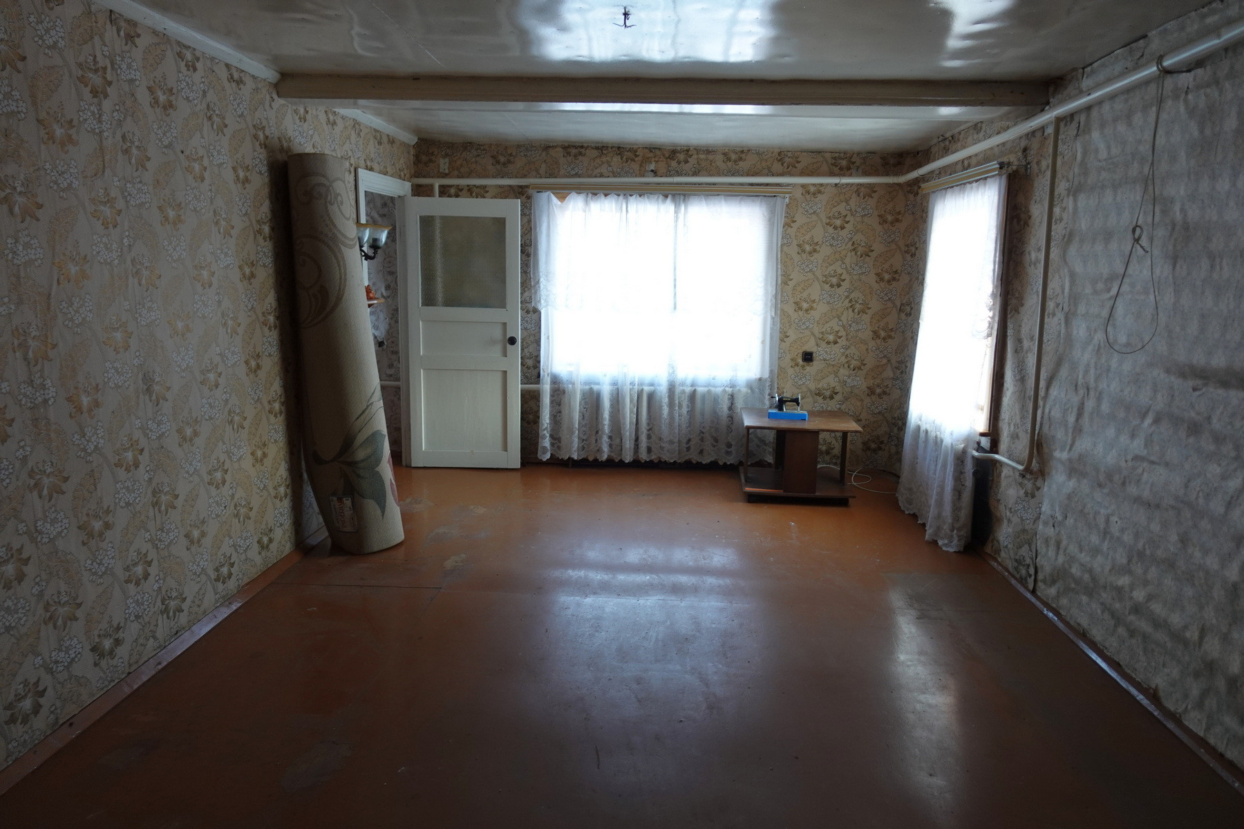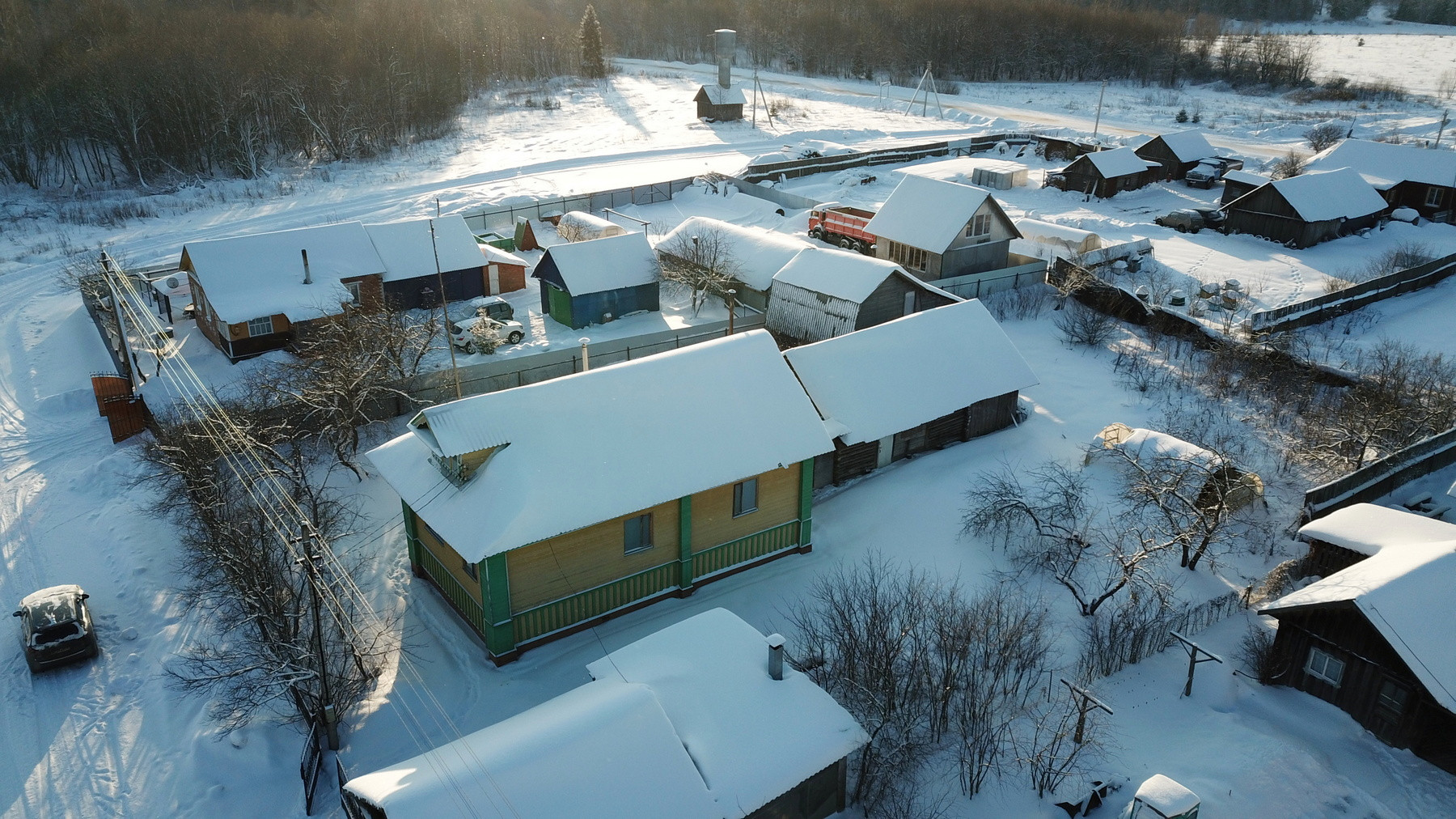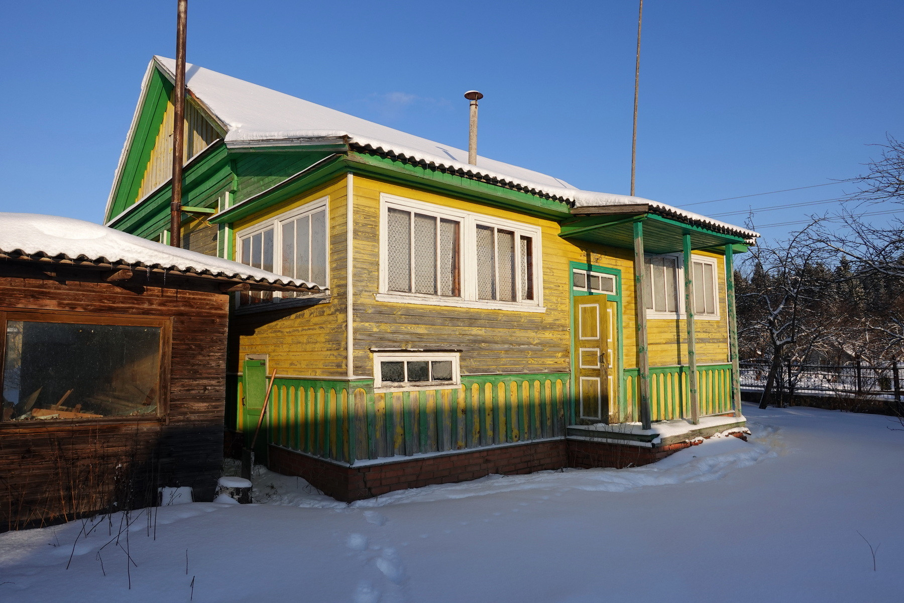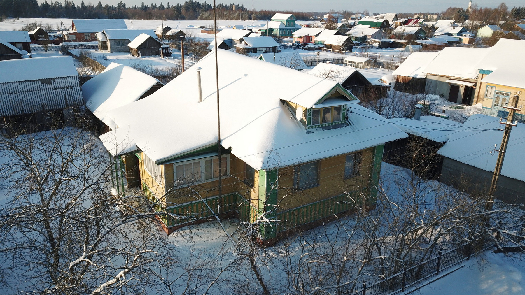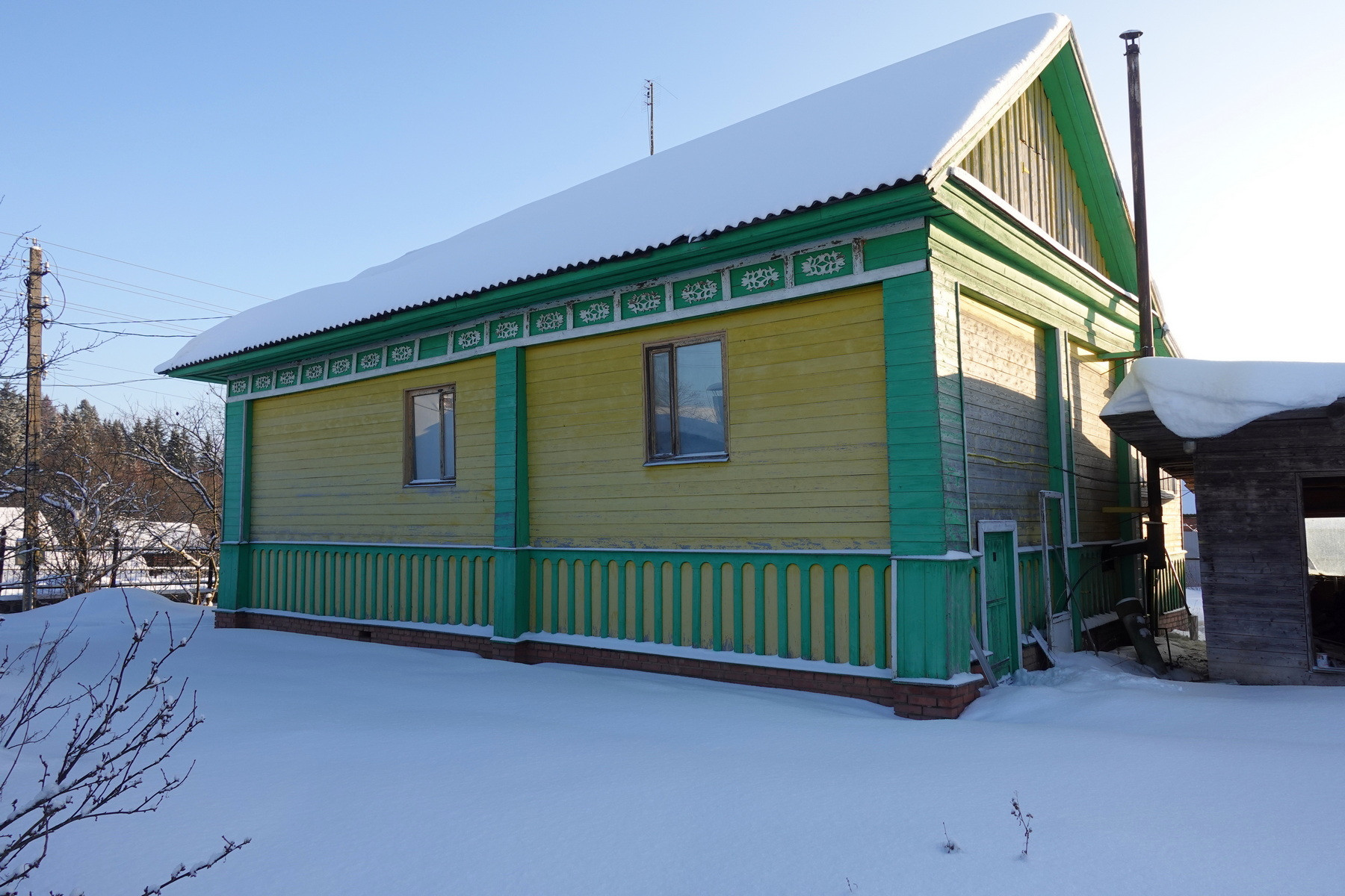 Четыре комнаты, кухня, прихожая, санузел, котельная, веранда. Высокое сухое подполье для хранения продуктов. Множество подсобных помещений и хозяйственных построек (баня, гараж, столярка и т.п.). Снаружи дом отделан облицовочной доской (тёсом), внутри: комнаты обклеены обоями, кухня и прихожая - деревянными панелями. Отопление – твердотопливный котёл (дрова, уголь), по всему дому разведены чугунные радиаторы. Центральное водоснабжение (водонапорная башня). Так же на участке есть скважина. Автономная канализация.