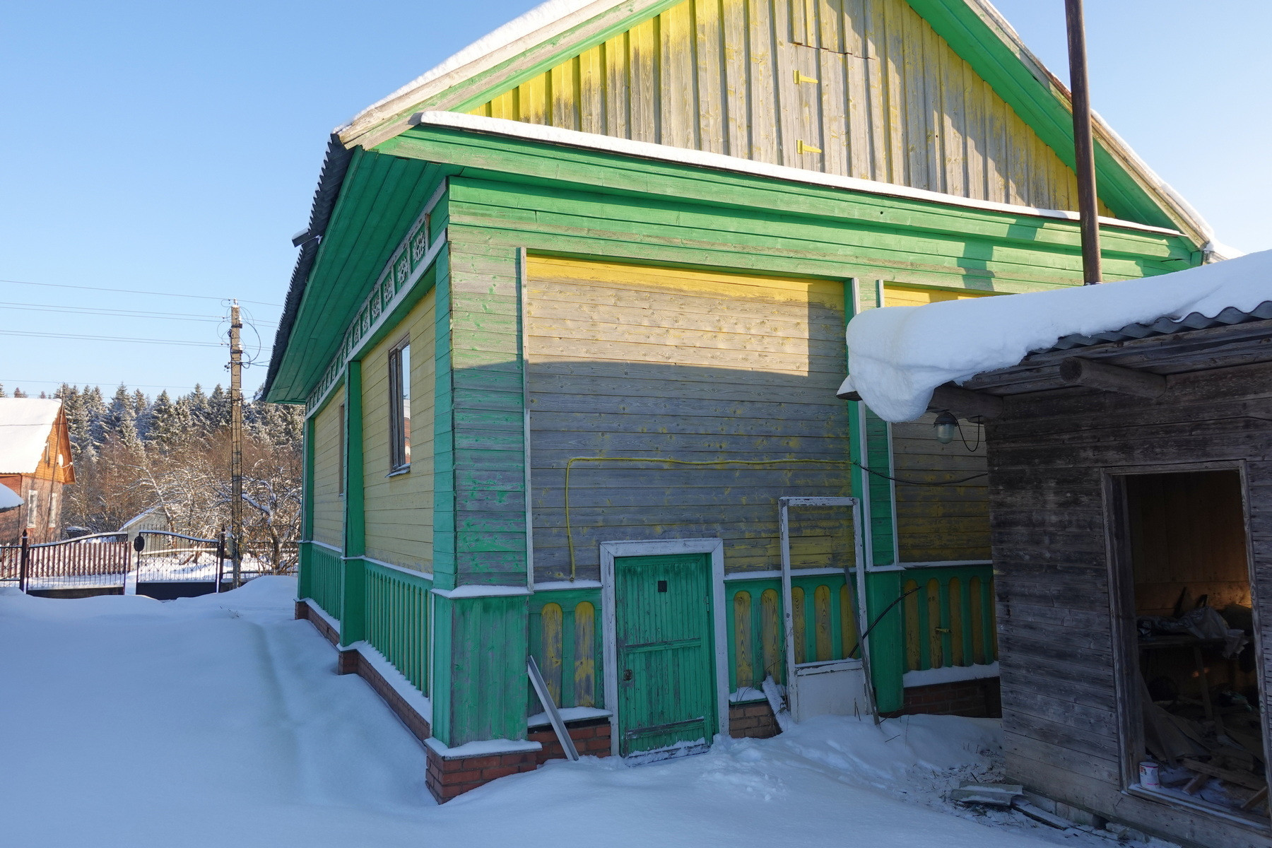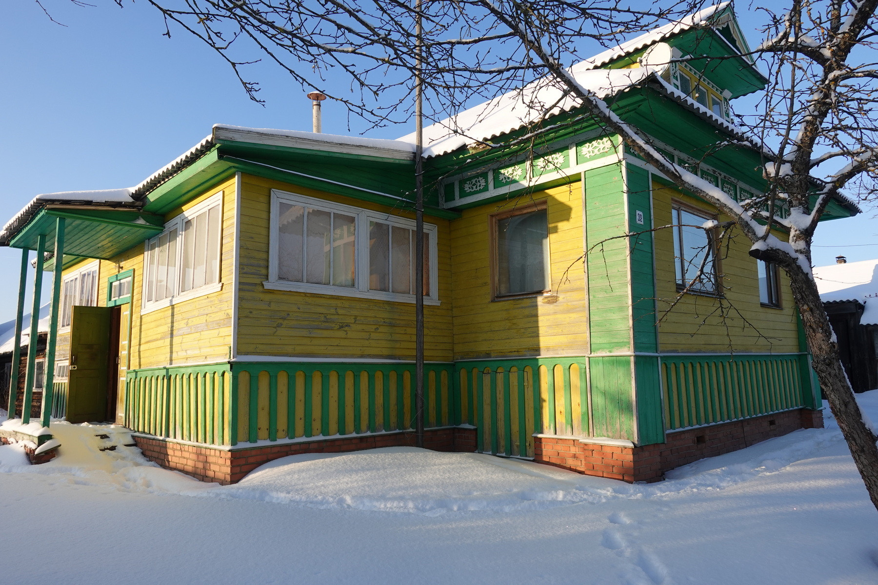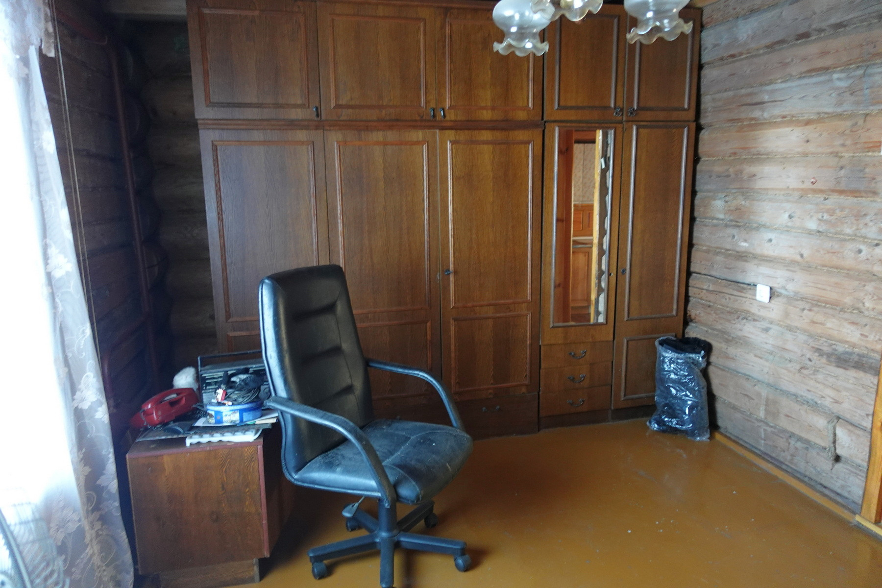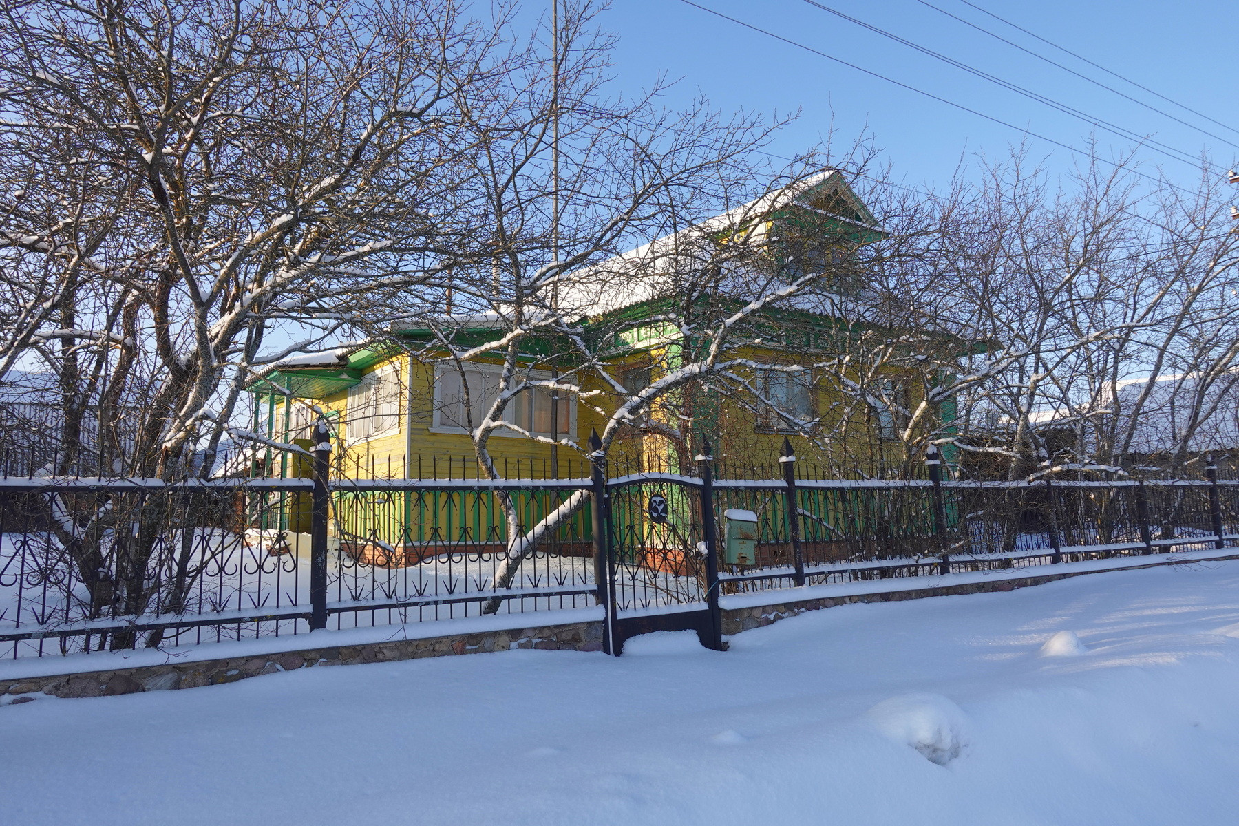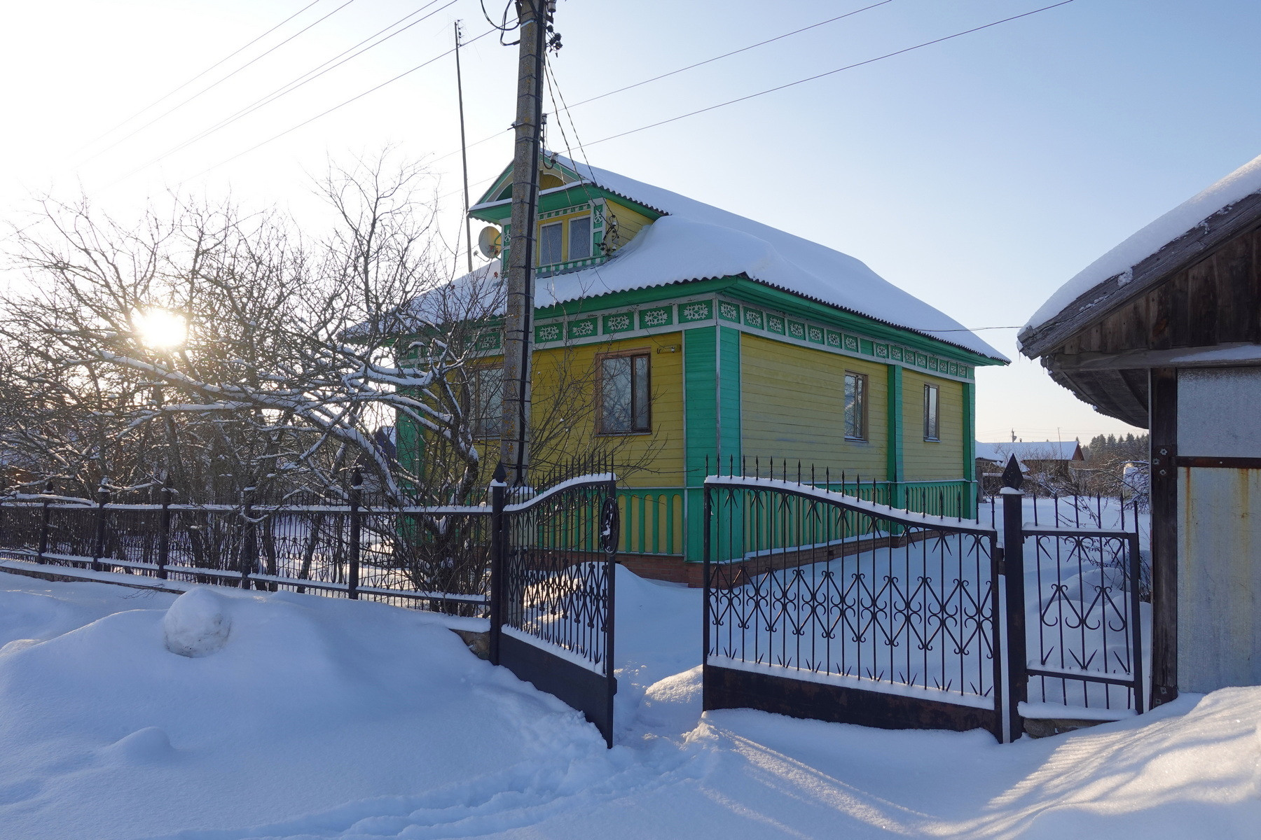 Четыре комнаты, кухня, прихожая, санузел, котельная, веранда. Высокое сухое подполье для хранения продуктов. Множество подсобных помещений и хозяйственных построек (баня, гараж, столярка и т.п.). Снаружи дом отделан облицовочной доской (тёсом), внутри: комнаты обклеены обоями, кухня и прихожая - деревянными панелями. Отопление – твердотопливный котёл (дрова, уголь), по всему дому разведены чугунные радиаторы. Центральное водоснабжение (водонапорная башня). Так же на участке есть скважина. Автономная канализация.