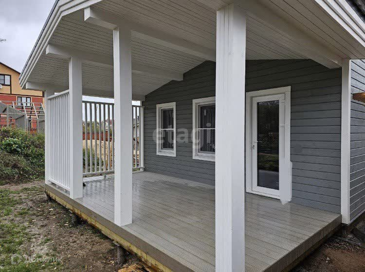 Дом 9х6 метров, с крыльцом 2,5м2 и террасой 17,6м2. Общая площадь - 106м2. Дом построен на фундамента монолитная плита. Отделка фасада скандинавская доска с поднятым ворсом с заводской покраской, окна ПВХ, вентиляция.