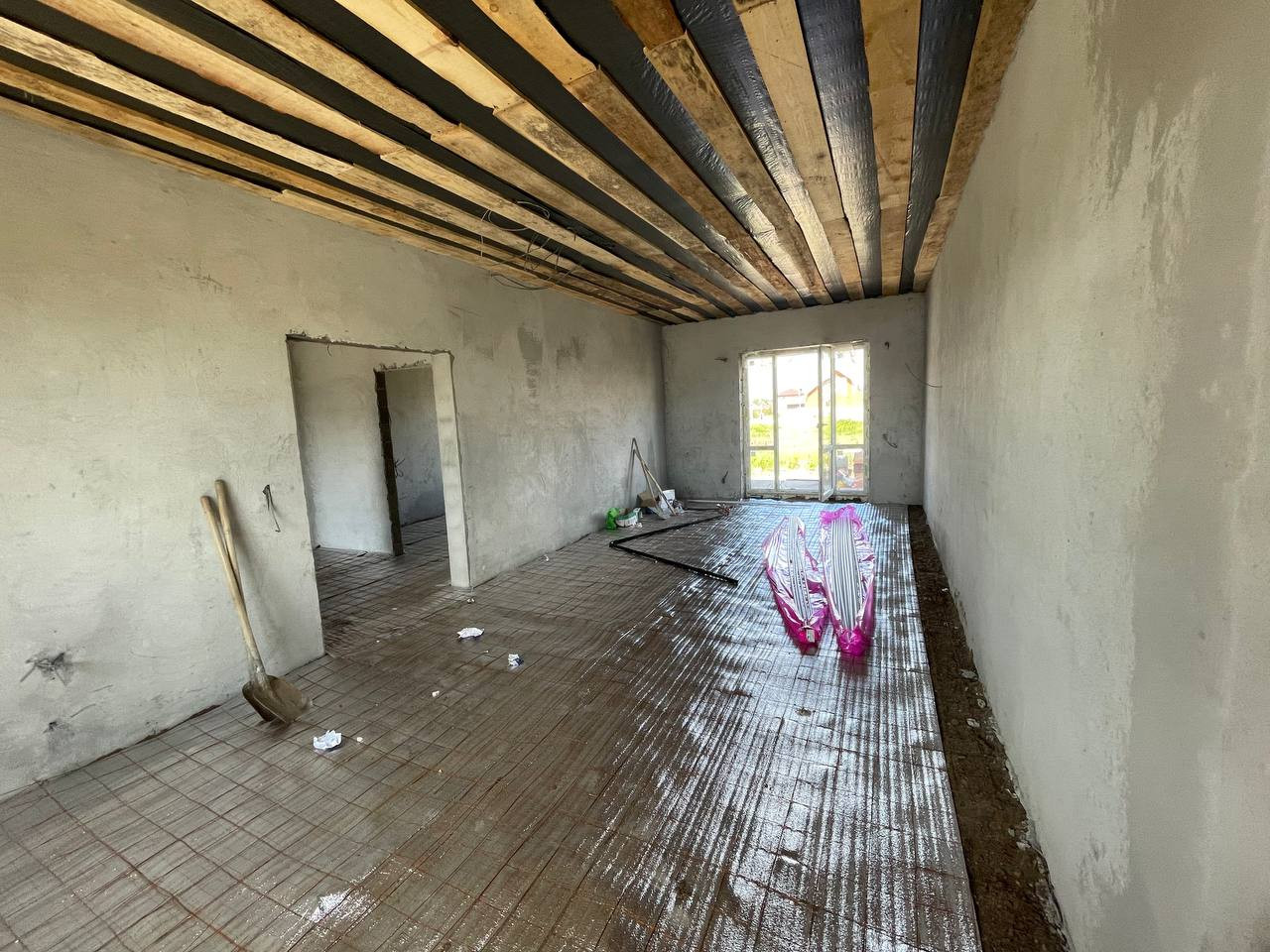 Три просторные спальные комнаты, большая кухня – гостиная с панорамным окном, санузел, кательная.