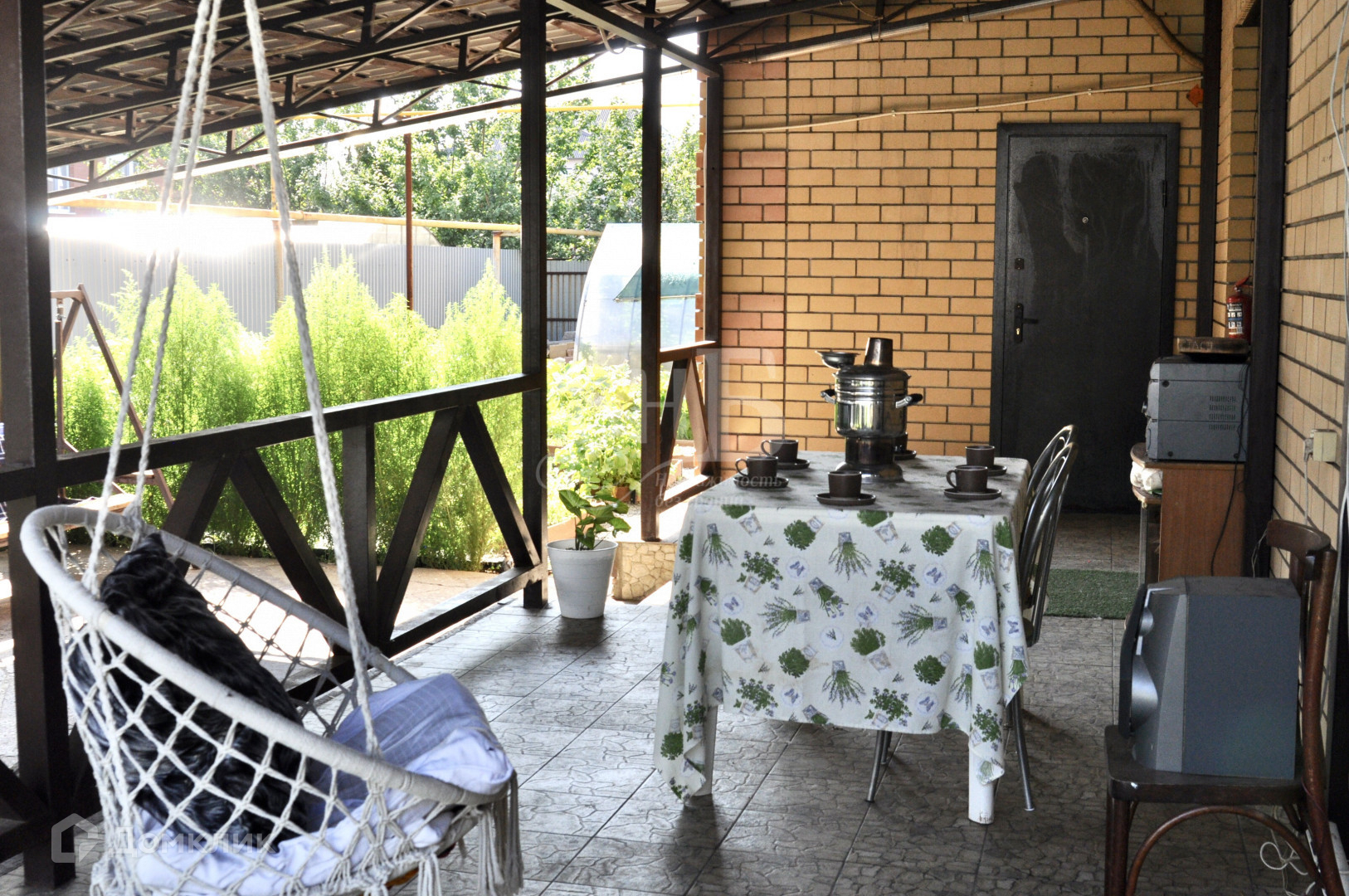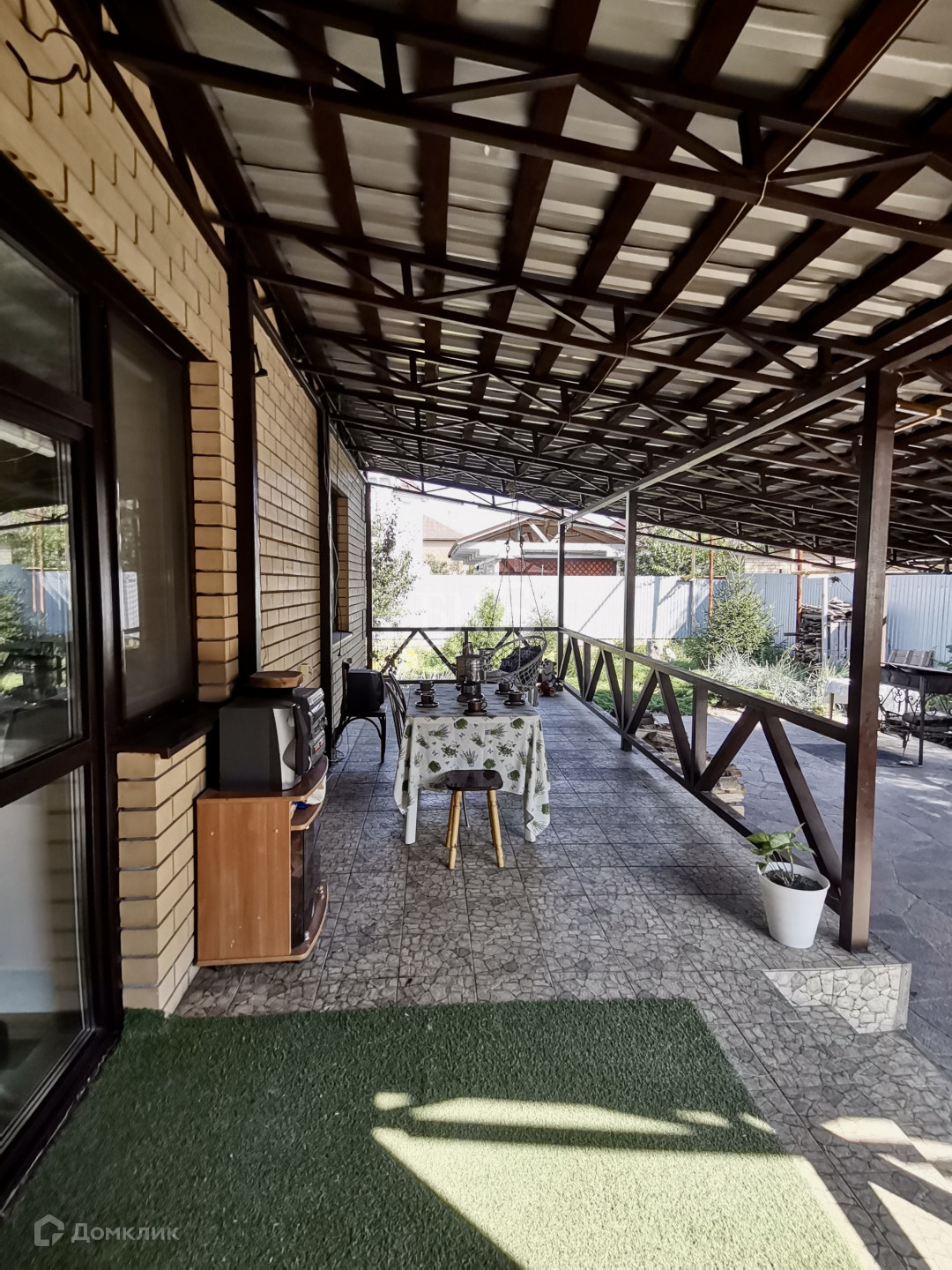 • Задний двор: огромная терраса под навесом с зоной отдыха (подвесными и напольными качелями) и зоной барбекю вместит ваших многочисленных гостей и позволит комфортно разместиться даже в дождливую погоду!