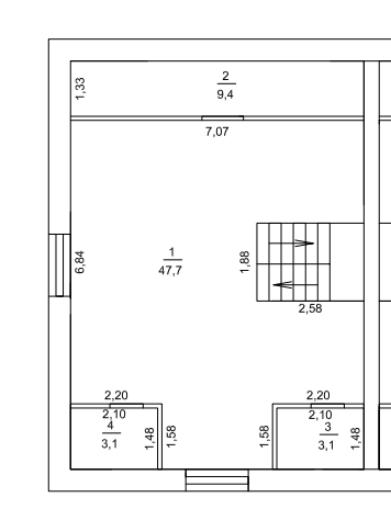 На втором этаже свободная планировка 47,6 кв.м. Можно разделить на две комнаты 23,6 кв.м. и 24,4 кв.м., санузел 5,3 кв.м.