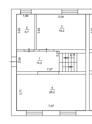 На первом этаже: просторная кухня-гостиная 26,4 кв.м., санузел 6,8 кв.м., жилая комната 18,3 кв.м., прихожая 14,1 кв.м.