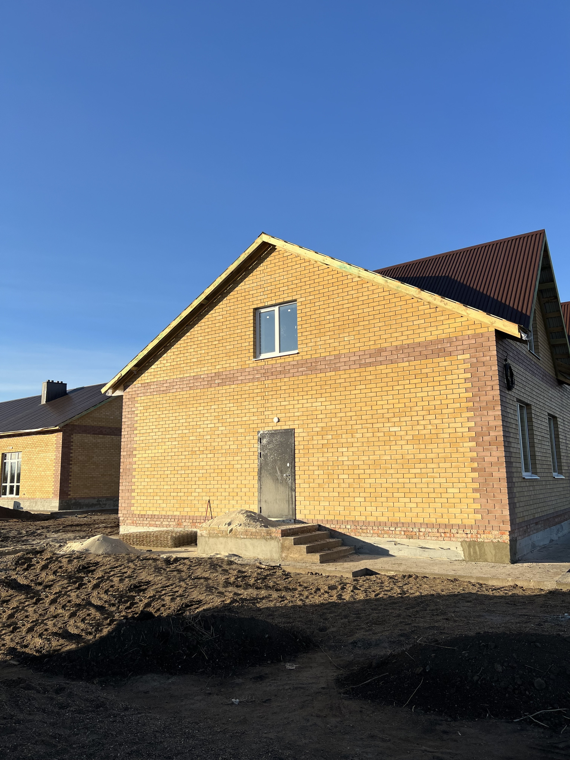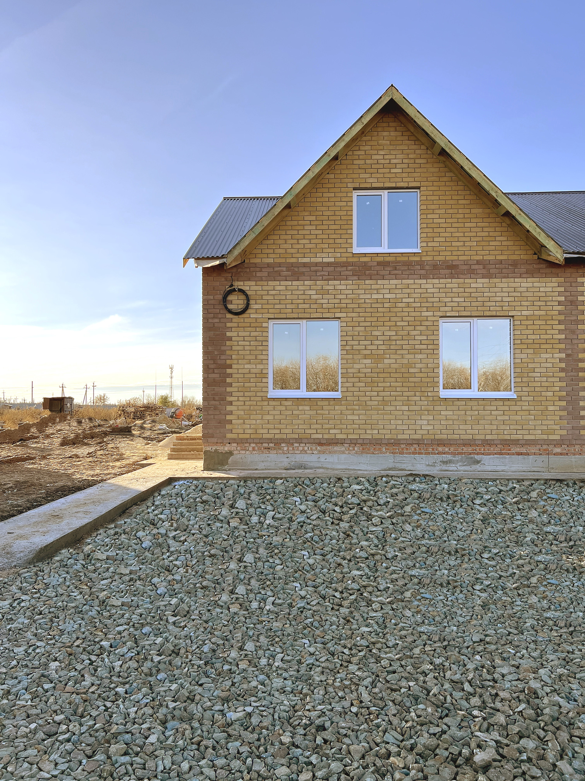 Построен из керамзит блока в блок + утепление 100 мм + отделка фасада кирпичом. В качестве кровельного материала применяется профлист с утеплителем 200 мм.