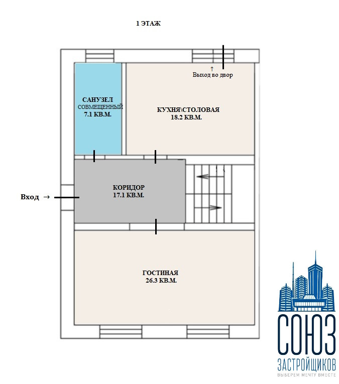 1 этаж: Удобная планировка с 2 мя отдельными комнатами, просторной кухней-гостиной, большой сан/узел.